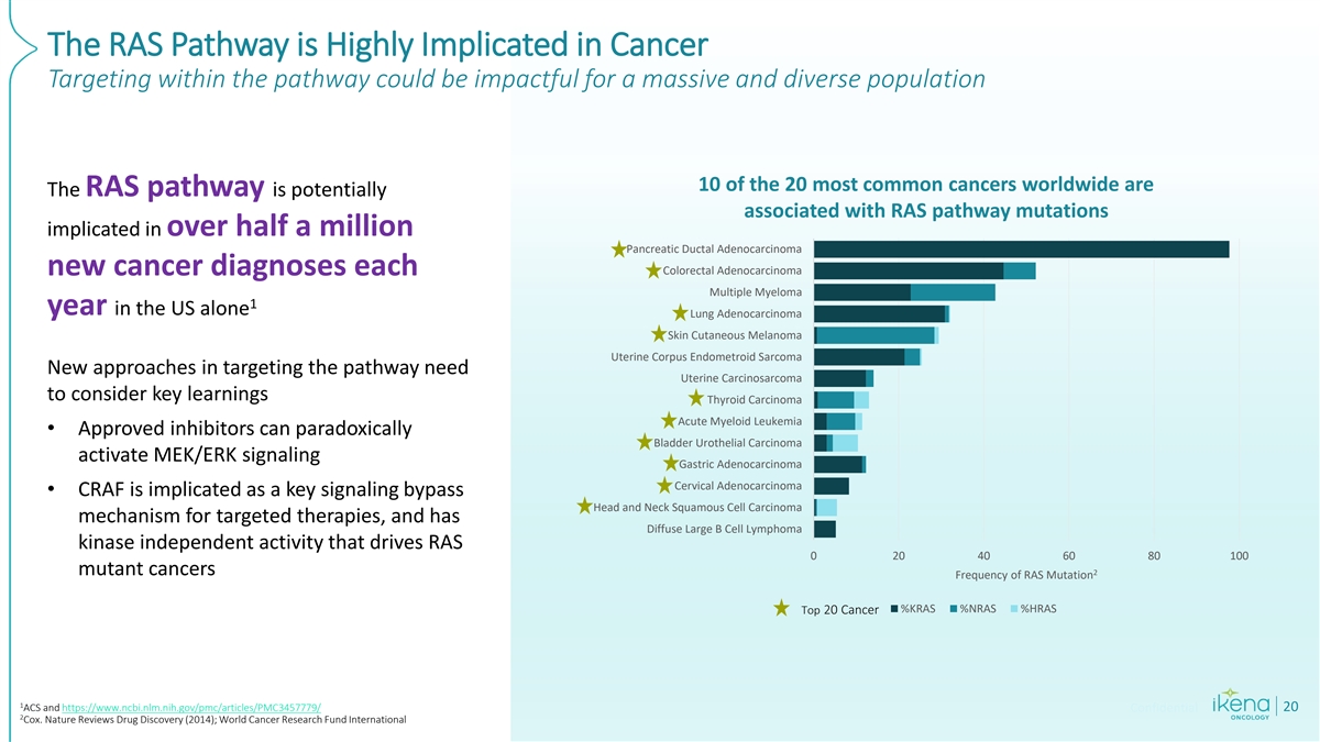The RAS Pathway is Highly Implicated in Cancer Targeting within the pathway could be impactful for a massive and diverse population 10 of the 20 most common cancers worldwide are The RAS pathway is potentially associated with RAS pathway mutations implicated in over half a million Pancreatic Ductal Adenocarcinoma Colorectal Adenocarcinoma new cancer diagnoses each Multiple Myeloma 1 year in the US alone Lung Adenocarcinoma Skin Cutaneous Melanoma Uterine Corpus Endometroid Sarcoma New approaches in targeting the pathway need Uterine Carcinosarcoma to consider key learnings Thyroid Carcinoma Acute Myeloid Leukemia • Approved inhibitors can paradoxically Bladder Urothelial Carcinoma activate MEK/ERK signaling Gastric Adenocarcinoma Cervical Adenocarcinoma • CRAF is implicated as a key signaling bypass Head and Neck Squamous Cell Carcinoma mechanism for targeted therapies, and has Diffuse Large B Cell Lymphoma kinase independent activity that drives RAS 0 20 40 60 80 100 mutant cancers 2 Frequency of RAS Mutation %KRAS %NRAS %HRAS Top 20 Cancer 1 ACS and https://www.ncbi.nlm.nih.gov/pmc/articles/PMC3457779/ Confidential 20 20 2 Cox. Nature Reviews Drug Discovery (2014); World Cancer Research Fund International