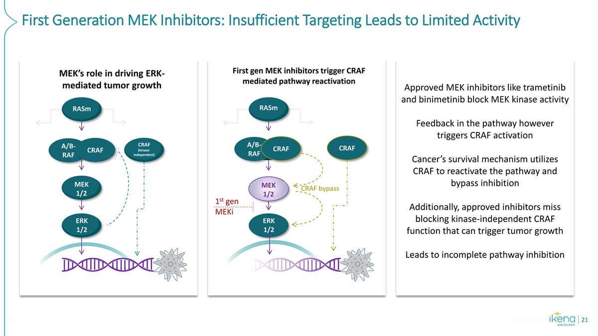 First Generation MEK Inhibitors: Insufficient Targeting Leads to Limited Activity First gen MEK inhibitors trigger CRAF MEK’s role in driving ERK- mediated pathway reactivation mediated tumor growth Approved MEK inhibitors like trametinib and binimetinib block MEK kinase activity RASm RASm Feedback in the pathway however triggers CRAF activation CRAF A/B- A/B- CRAF CRAF (kinase- CRAF independent) RAF RAF Cancer’s survival mechanism utilizes CRAF to reactivate the pathway and bypass inhibition MEK MEK CRAF bypass 1/2 1/2 st 1 gen Additionally, approved inhibitors miss MEKi blocking kinase-independent CRAF ERK ERK 1/2 1/2 function that can trigger tumor growth Leads to incomplete pathway inhibition Confidential 21 21