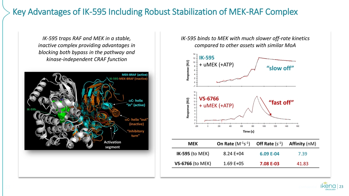 Key Advantages of IK-595 Including Robust Stabilization of MEK-RAF Complex IK-595 traps RAF and MEK in a stable, IK-595 binds to MEK with much slower off-rate kinetics inactive complex providing advantages in compared to other assets with similar MoA blocking both bypass in the pathway and IK-595 kinase-independent CRAF function + uMEK (+ATP) “slow off” VS-6766 “fast off” + uMEK (+ATP) -1 -1 -1 MEK On Rate (M s ) Off Rate (s ) Affinity (nM) IK-595 (to MEK) 8.24 E+04 6.09 E-04 7.39 VS-6766 (to MEK) 1.69 E+05 7.08 E-03 41.83 Confidential 23 23