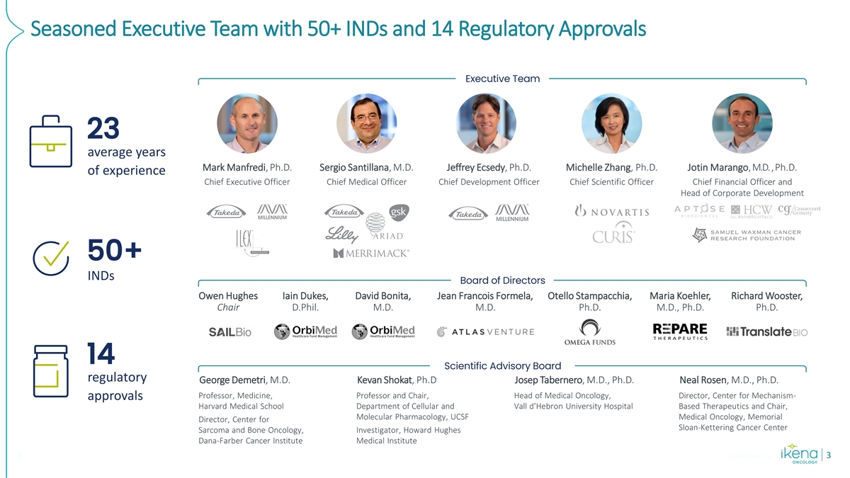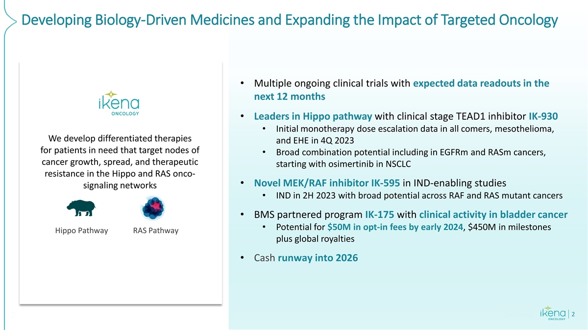 Developing Biology-Driven Medicines and Expanding the Impact of Targeted Oncology • Multiple ongoing clinical trials with expected data readouts in the next 12 months • Leaders in Hippo pathway with clinical stage TEAD1 inhibitor IK-930 • Initial monotherapy dose escalation data in all comers, mesothelioma, We develop differentiated therapies and EHE in 4Q 2023 for patients in need that target nodes of • Broad combination potential including in EGFRm and RASm cancers, cancer growth, spread, and therapeutic starting with osimertinib in NSCLC resistance in the Hippo and RAS onco- • Novel MEK/RAF inhibitor IK-595 in IND-enabling studies signaling networks • IND in 2H 2023 with broad potential across RAF and RAS mutant cancers • BMS partnered program IK-175 with clinical activity in bladder cancer • Potential for $50M in opt-in fees by early 2024, $450M in milestones Hippo Pathway RAS Pathway plus global royalties • Cash runway into 2026 Confidential 2 2