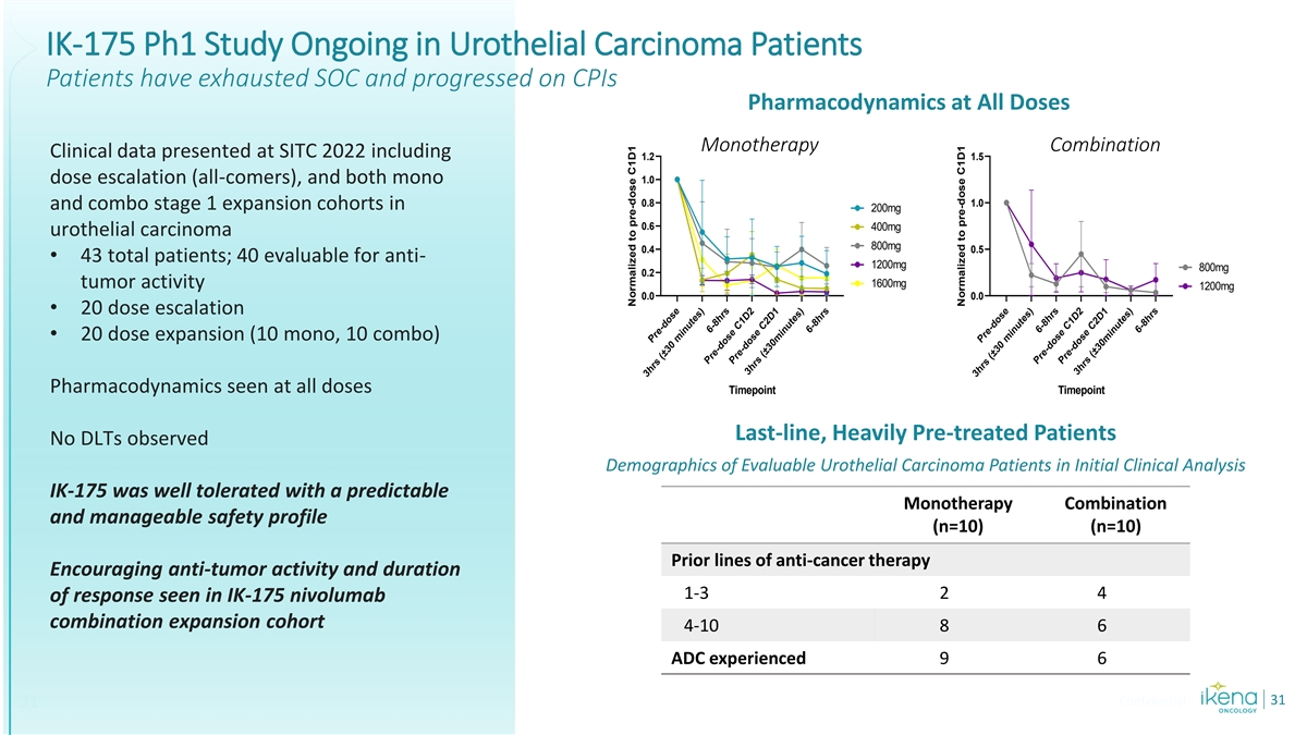 IK-175 Ph1 Study Ongoing in Urothelial Carcinoma Patients Patients have exhausted SOC and progressed on CPIs Pharmacodynamics at All Doses Monotherapy Combination Clinical data presented at SITC 2022 including 1.2 1.5 dose escalation (all-comers), and both mono 1.0 0.8 1.0 and combo stage 1 expansion cohorts in 200mg 0.6 400mg urothelial carcinoma 800mg 0.4 0.5 • 43 total patients; 40 evaluable for anti- 1200mg 800mg 0.2 1600mg tumor activity 1200mg 0.0 0.0 • 20 dose escalation • 20 dose expansion (10 mono, 10 combo) Pharmacodynamics seen at all doses Timepoint Timepoint Last-line, Heavily Pre-treated Patients No DLTs observed Demographics of Evaluable Urothelial Carcinoma Patients in Initial Clinical Analysis IK-175 was well tolerated with a predictable Monotherapy Combination and manageable safety profile (n=10) (n=10) Prior lines of anti-cancer therapy Encouraging anti-tumor activity and duration 1-3 2 4 of response seen in IK-175 nivolumab combination expansion cohort 4-10 8 6 ADC experienced 9 6 Confidential 31 31 Pre-dose 3hrs (±30 minutes) 6-8hrs Pre-dose C1D2 Pre-dose C2D1 3hrs (±30minutes) 6-8hrs - ( t ) - - - ( t ) - Pre dose 3hrs ±30 minu es 6 8hrs Pre dose C1D2 Pre dose C2D1 3hrs ±30minu es 6 8hrs Normalized to pre-dose C1D1 Normalized to pre-dose C1D1
