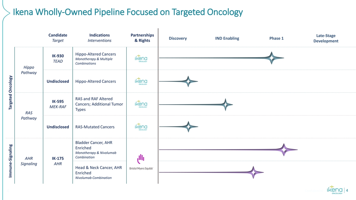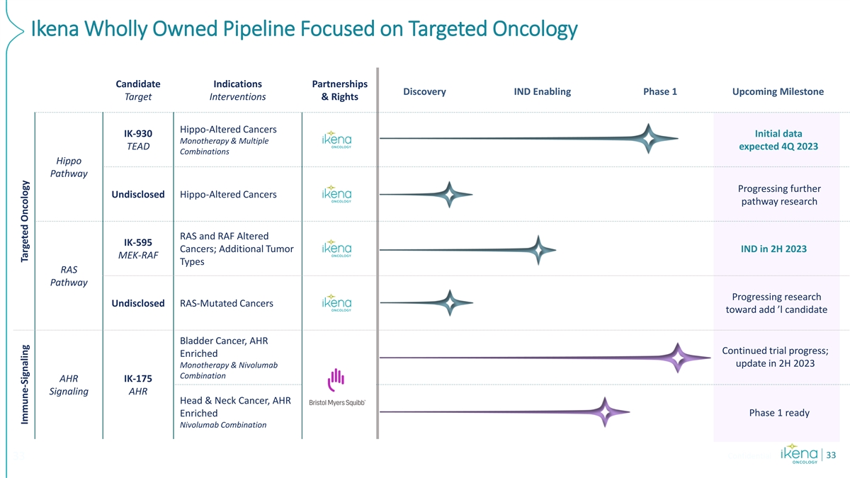 Ikena Wholly Owned Pipeline Focused on Targeted Oncology Candidate Indications Partnerships Discovery IND Enabling Phase 1 Upcoming Milestone Target Interventions & Rights Hippo-Altered Cancers IK-930 Initial data Monotherapy & Multiple TEAD expected 4Q 2023 Combinations Hippo Pathway Progressing further Undisclosed Hippo-Altered Cancers pathway research RAS and RAF Altered IK-595 Cancers; Additional Tumor IND in 2H 2023 MEK-RAF Types RAS Pathway Progressing research Undisclosed RAS-Mutated Cancers toward add ’l candidate Bladder Cancer, AHR Continued trial progress; Enriched update in 2H 2023 Monotherapy & Nivolumab Combination AHR IK-175 Signaling AHR Head & Neck Cancer, AHR Phase 1 ready Enriched Nivolumab Combination Confidential 33 33 Immune-Signaling Targeted Oncology