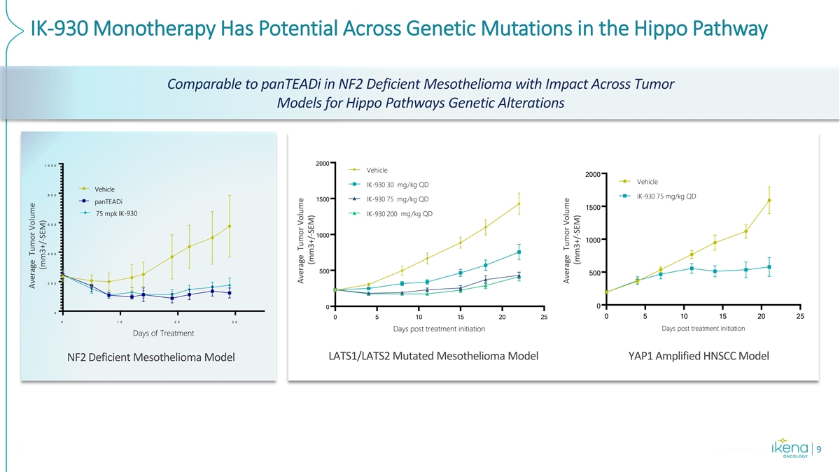 IK-930 Monotherapy Has Potential Across Genetic Mutations in the Hippo Pathway Comparable to panTEADi in NF2 Deficient Mesothelioma with Impact Across Tumor Models for Hippo Pathways Genetic Alterations 2000 1 0 0 0 Vehicle 2000 Vehicle IK-930 30 mg/kg QD Vehicle 8 0 0 IK-930 75 mg/kg QD 1500 IK-930 75 mg/kg QD panTEADi 1500 75 mpk IK-930 IK-930 200 mg/kg QD 6 0 0 1000 1000 4 0 0 500 500 2 0 0 0 0 0 0 5 10 15 20 25 0 5 10 15 20 25 0 1 0 2 0 3 0 Days post treatment initiation Days post treatment initiation Days of Treatment LATS1/LATS2 Mutated Mesothelioma Model YAP1 Amplified HNSCC Model NF2 Deficient Mesothelioma Model Confidential 9 9 Average Tumor Volume (mm3+/-SEM) Average Tumor Volume (mm3+/-SEM) Average Tumor Volume (mm3+/-SEM)