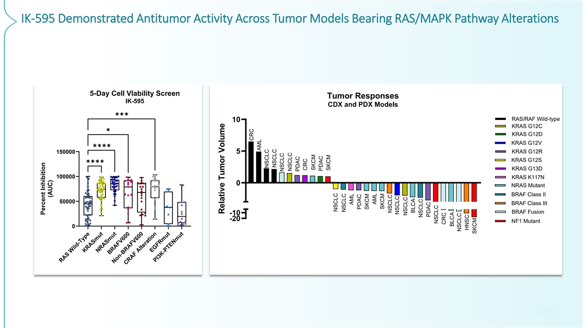 IK-595 Demonstrated Antitumor Activity Across Tumor Models Bearing RAS/MAPK Pathway Alterations 5-Day Cell VIability Screen Tumor Responses IK-595 CDX and PDX Models ✱✱✱ RAS/RAF Wild-type 10 KRAS G12C ✱ KRAS G12D KRAS G12V ✱✱✱✱ 150000 5 KRAS G12R KRAS G12S ✱✱✱✱ KRAS G13D 100000 KRAS K117N 0 NRAS Mutant BRAF Class II 50000 BRAF Class III BRAF Fusion -10 -20 NF1 Mutant 0 Confidential 10 10 RAS Wild-Type KRASmut NRASmut BRAFV600 Non-BRAFV600 CRAF Alteration EGFRmut PI3K-PTENmut Percent Inhibition (AUC) Relative Tumor Volume CRC AML NSCLC NSCLC NSCLC NSCLC PDAC CRC SKCM PDAC SKCM NSCLC NSCLC AML PDAC SKCM AML SKCM NSCLC NSCLC NSCLC BLCA NSCLC PDAC NSCLC CRC BLCA NSCLC HNSC SKCM