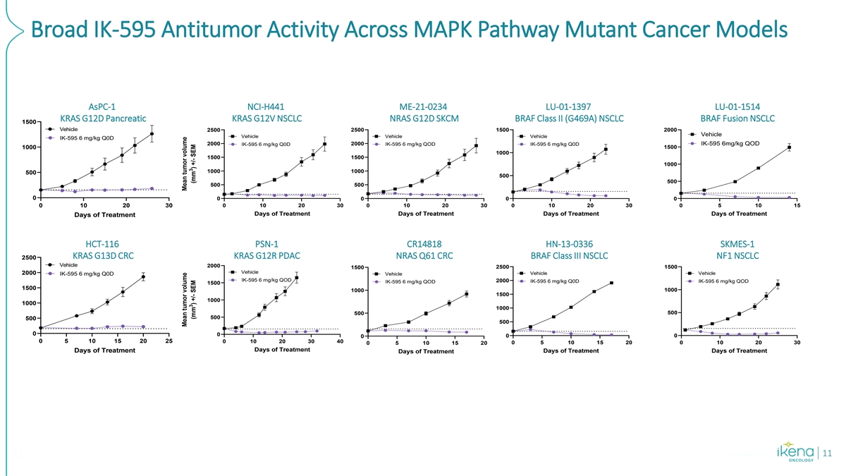 Broad IK-595 Antitumor Activity Across MAPK Pathway Mutant Cancer Models AsPC-1 NCI-H441 ME-21-0234 LU-01-1397 LU-01-1514 NCI-H441 Tumor Growth ME-21-0234 Tumor Growth LU-01-1397 Tumor Growth LU-01-1514 Tumor Growth KRAS G12V NSCLC NRAS G12D SKCM BRAF Class II (G469A) NSCLC BRAF Fusion NSCLC KRAS G12D Pancreatic KRAS G12V NSCLC NRAS G12D SKCM BRAF Class II (G469A) NSCLC BRAF Fusion NSCLC 1500 Vehicle 2500 2500 1500 2000 Vehicle Vehicle Vehicle Vehicle IK-595 6 mg/kg Q0D 2000 2000 IK-595 6mg/kg QOD IK-595 6 mg/kg Q0D IK-595 6 mg/kg QOD IK-595 6 mg/kg Q0D 1000 1500 1000 1500 1500 1000 1000 1000 500 500 500 500 500 0 0 0 0 0 0 10 20 30 0 10 20 30 0 10 20 30 0 10 20 30 0 5 10 15 Days of Treatment Days of Treatment Days of Treatment Days of Treatment Days of Treatment HCT-116 PSN-1 CR14818 HN-13-0336 SKMES-1 PSN-1 Tumor Growth HN-13-0336 Tumor Growth SKMES-1 Tumor Growth CR14818 Tumor Growth KRAS G12R PDAC NRAS Q61 CRC BRAF Class III HNSCC NF1 Mutant NSCLC KRAS G13D CRC KRAS G12R PDAC NRAS Q61 CRC BRAF Class III NSCLC NF1 NSCLC 2500 Vehicle 2000 2500 1500 1500 Vehicle 2000 Vehicle Vehicle IK-595 6 mg/kg Q0D Vehicle IK-595 6 mg/kg QOD 2000 IK-595 6 mg/kg Q0D IK-595 6 mg/kg QOD IK-595 6 mg/kg QOD 1500 1500 1000 1000 1500 1000 1000 1000 500 500 500 500 500 0 0 0 0 0 0 5 10 15 20 25 0 10 20 30 40 0 5 10 15 20 0 5 10 15 20 0 10 20 30 Days of Treatment Days of Treatment Days of Treatment Days of Treatment Days of Treatment Confidential 11 11 Mean tumor volume Mean tumor volume 3 3 (mm ) +/- SEM (mm ) +/- SEM