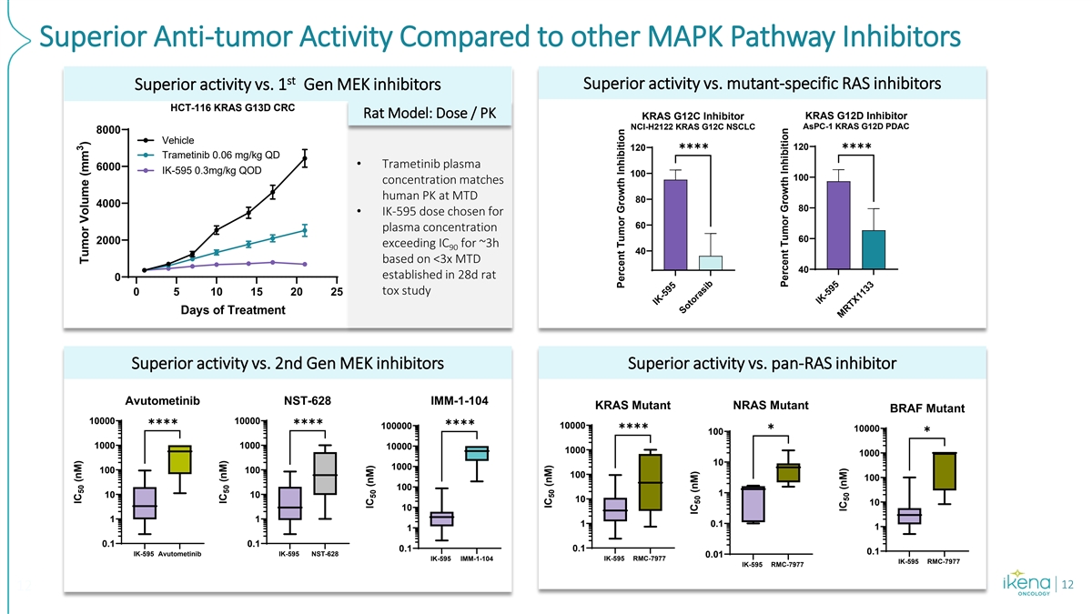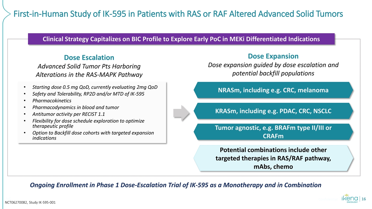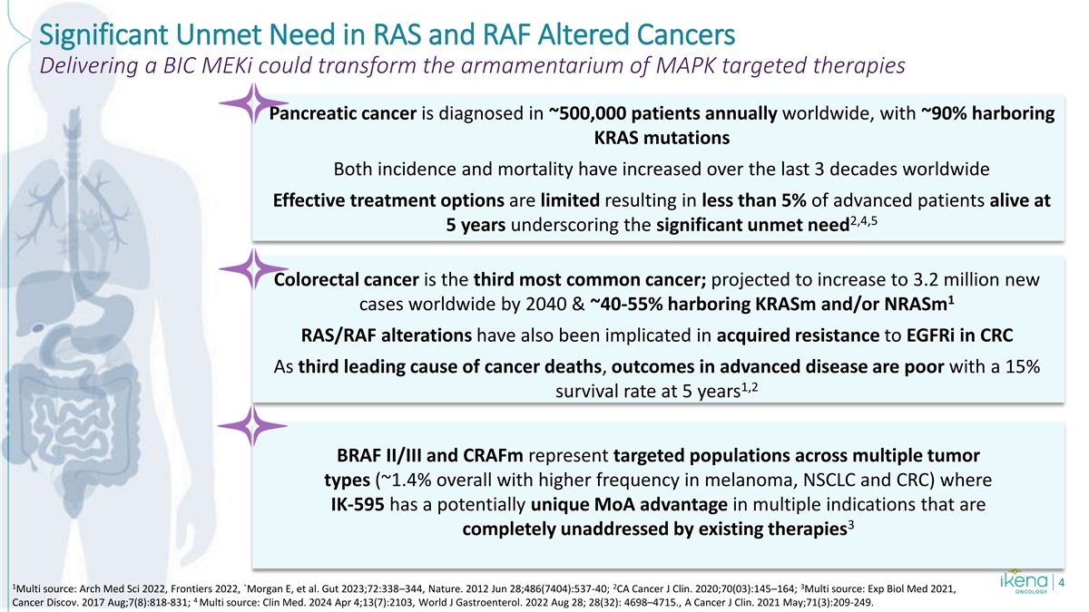 Significant Unmet Need in RAS and RAF Altered Cancers Delivering a BIC MEKi could transform the armamentarium of MAPK targeted therapies Pancreatic cancer is diagnosed in ~500,000 patients annually worldwide, with ~90% harboring KRAS mutations Both incidence and mortality have increased over the last 3 decades worldwide Effective treatment options are limited resulting in less than 5% of advanced patients alive at 2,4,5 5 years underscoring the significant unmet need Colorectal cancer is the third most common cancer; projected to increase to 3.2 million new 1 cases worldwide by 2040 & ~40-55% harboring KRASm and/or NRASm RAS/RAF alterations have also been implicated in acquired resistance to EGFRi in CRC As third leading cause of cancer deaths, outcomes in advanced disease are poor with a 15% 1,2 survival rate at 5 years BRAF II/III and CRAFm represent targeted populations across multiple tumor types (~1.4% overall with higher frequency in melanoma, NSCLC and CRC) where IK-595 has a potentially unique MoA advantage in multiple indications that are 3 completely unaddressed by existing therapies 4 1 2 3 Multi source: Arch Med Sci 2022, Frontiers 2022, `Morgan E, et al. Gut 2023;72:338–344, Nature. 2012 Jun 28;486(7404):537-40; CA Cancer J Clin. 2020;70(03):145–164; Multi source: Exp Biol Med 2021, 4 Cancer Discov. 2017 Aug;7(8):818-831; Multi source: Clin Med. 2024 Apr 4;13(7):2103, World J Gastroenterol. 2022 Aug 28; 28(32): 4698–4715., A Cancer J Clin. 2021 May;71(3):209-249.