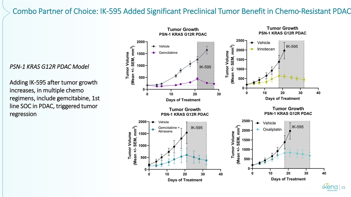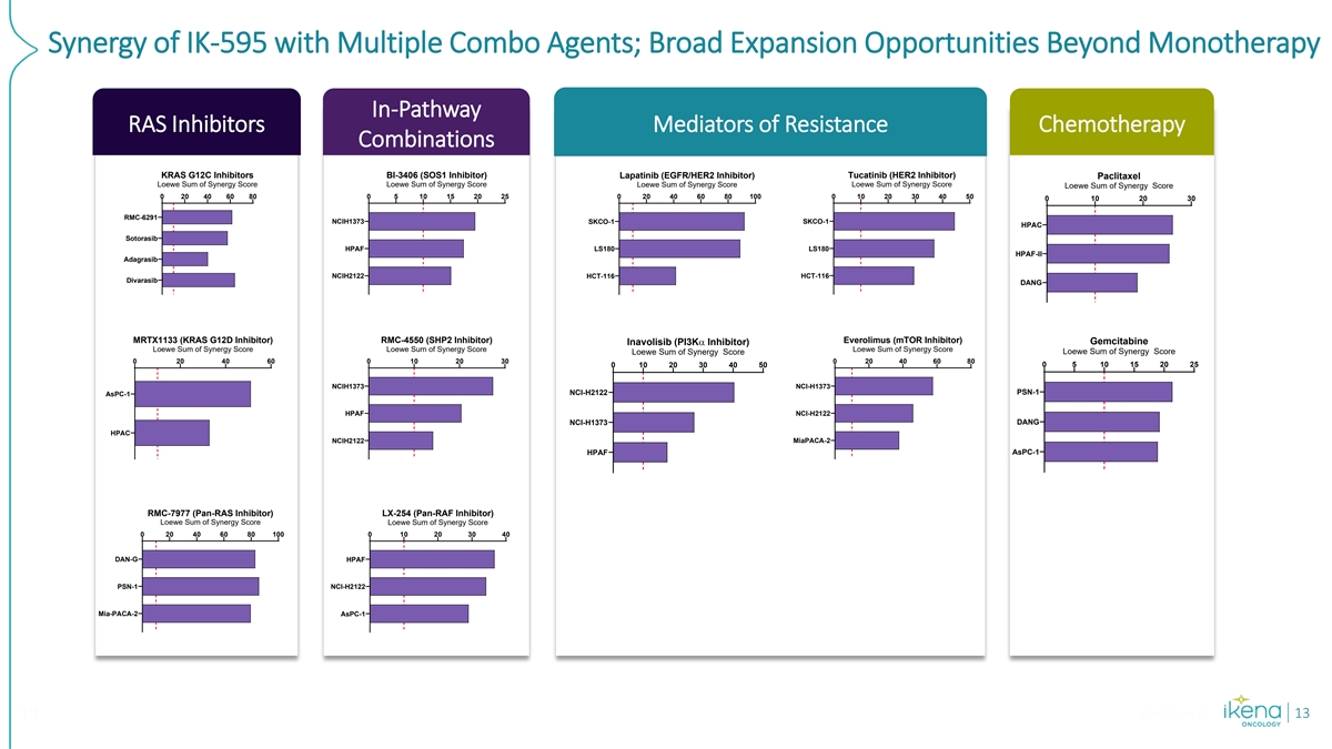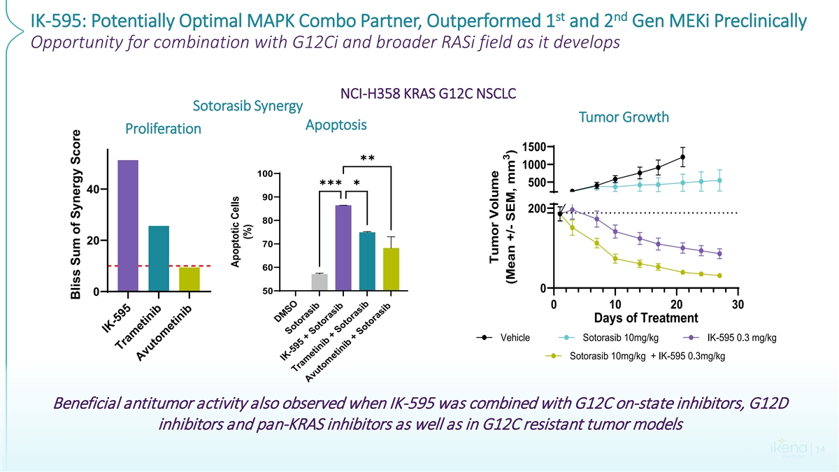Synergy of IK-595 with Multiple Combo Agents; Broad Expansion Opportunities Beyond Monotherapy In-Pathway RAS Inhibitors Mediators of Resistance Chemotherapy Combinations KRAS G12C Inhibitors BI-3406 (SOS1 Inhibitor) Lapatinib (EGFR/HER2 Inhibitor) Tucatinib (HER2 Inhibitor) Paclitaxel Loewe Sum of Synergy Score Loewe Sum of Synergy Score Loewe Sum of Synergy Score Loewe Sum of Synergy Score Loewe Sum of Synergy Score 0 10 20 30 40 50 0 20 40 60 80 0 5 10 15 20 25 0 20 40 60 80 100 0 10 20 30 RMC-6291 NCIH1373 SKCO-1 SKCO-1 HPAC Sotorasib HPAF LS180 LS180 HPAF-II Adagrasib NCIH2122 HCT-116 HCT-116 Divarasib DANG MRTX1133 (KRAS G12D Inhibitor) RMC-4550 (SHP2 Inhibitor) Everolimus (mTOR Inhibitor) Inavolisib (PI3Kα Inhibitor) Gemcitabine Loewe Sum of Synergy Score Loewe Sum of Synergy Score Loewe Sum of Synergy Score Loewe Sum of Synergy Score Loewe Sum of Synergy Score 0 20 40 60 0 10 20 30 0 20 40 60 80 0 10 20 30 40 50 0 5 10 15 20 25 NCIH1373 NCI-H1373 NCI-H2122 PSN-1 AsPC-1 HPAF NCI-H2122 DANG NCI-H1373 HPAC NCIH2122 MiaPACA-2 HPAF AsPC-1 RMC-7977 (Pan-RAS Inhibitor) LX-254 (Pan-RAF Inhibitor) Loewe Sum of Synergy Score Loewe Sum of Synergy Score 0 20 40 60 80 100 0 10 20 30 40 DAN-G HPAF PSN-1 NCI-H2122 Mia-PACA-2 AsPC-1 Confidential 13 13