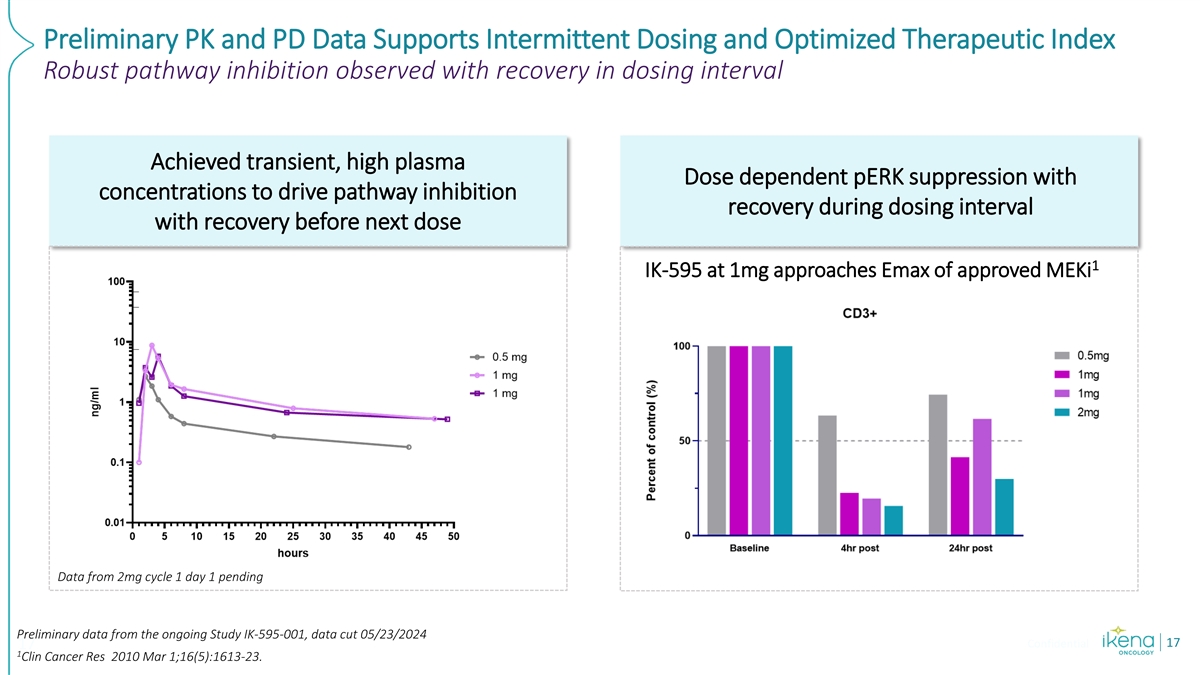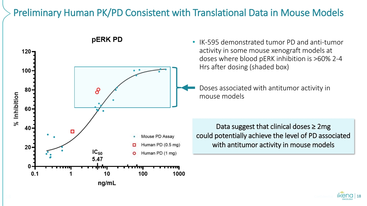 Preliminary PK and PD Data Supports Intermittent Dosing and Optimized Therapeutic Index Robust pathway inhibition observed with recovery in dosing interval Achieved transient, high plasma Dose dependent pERK suppression with concentrations to drive pathway inhibition recovery during dosing interval with recovery before next dose 1 IK-595 at 1mg approaches Emax of approved MEKi Data from 2mg cycle 1 day 1 pending Preliminary data from the ongoing Study IK-595-001, data cut 05/23/2024 Confidential 17 17 1 Clin Cancer Res 2010 Mar 1;16(5):1613-23.