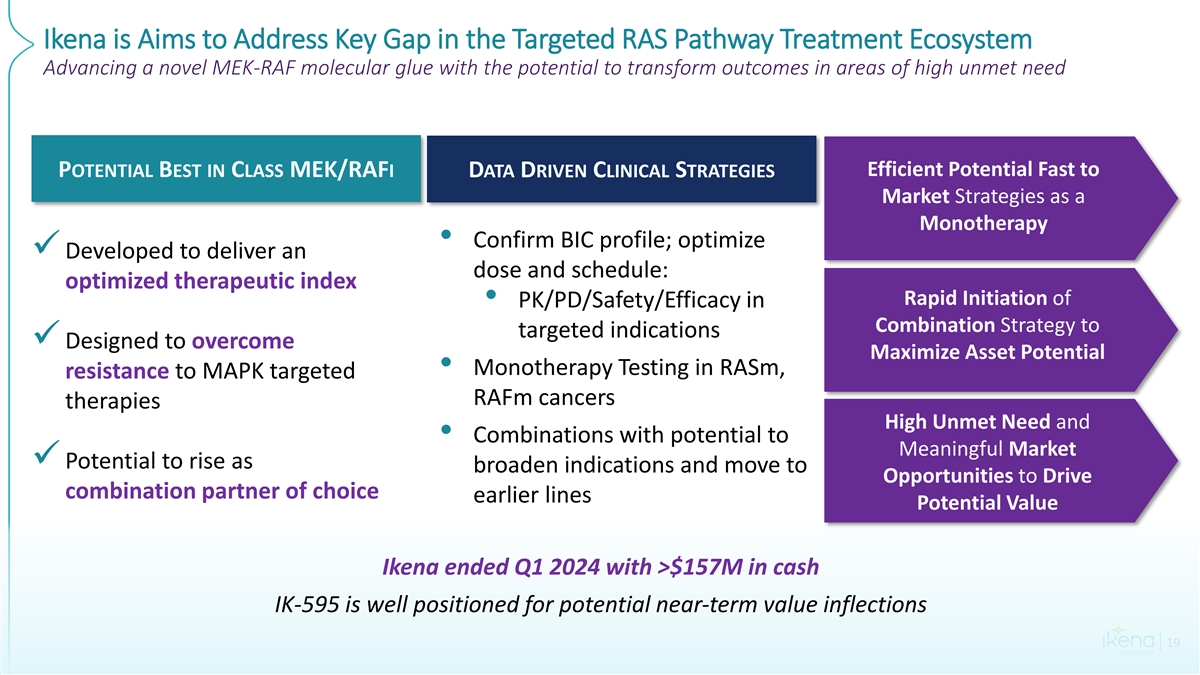 Ikena is Focused on Differentiated Therapies for RAS and RAF Altered Cancers Advancing a novel MEK-RAF molecular glue with the potential to transform outcomes in areas of high unmet need Candidate Interventions IND Enabling Phase 1 Later Stage Development Target Indications Monotherapy RAS and RAF altered cancers IK-595 MEK-RAF Combination Preclinical synergies with multiple agents IK-595 is designed to overcome the limitations of existing MEK and next gen MEK-RAF inhibitors with broad potential for patients with mutations across the RAS field both as a monotherapy and in combination IK-595 is designed with a greater therapeutic index and strong binding glue of MEK-RAF complex Dose escalation ongoing; early PK and PD data encouraging toward potential optimized therapeutic window; recruiting RASm and RAFm patients Company ended Q1 2024 with >$157M in cash with ongoing efforts to maximize shareholder value including potential strategic alternatives 3 1 ACS and https://www.ncbi.nlm.nih.gov/pmc/articles/PMC3457779/