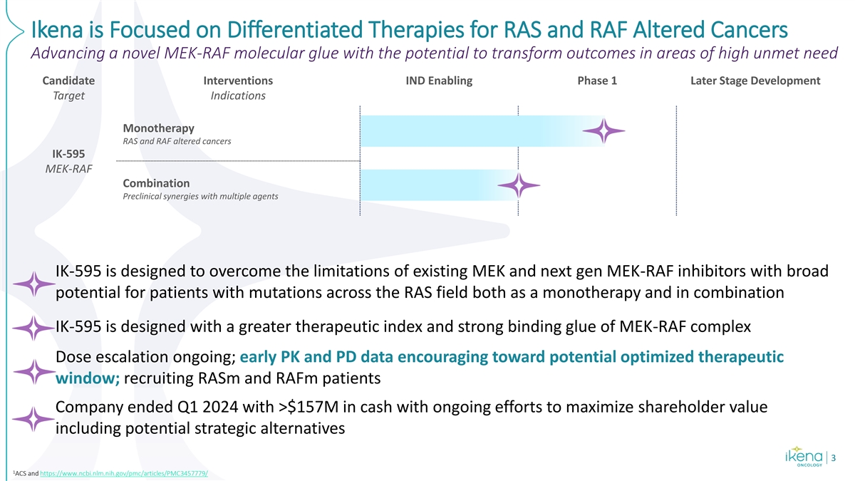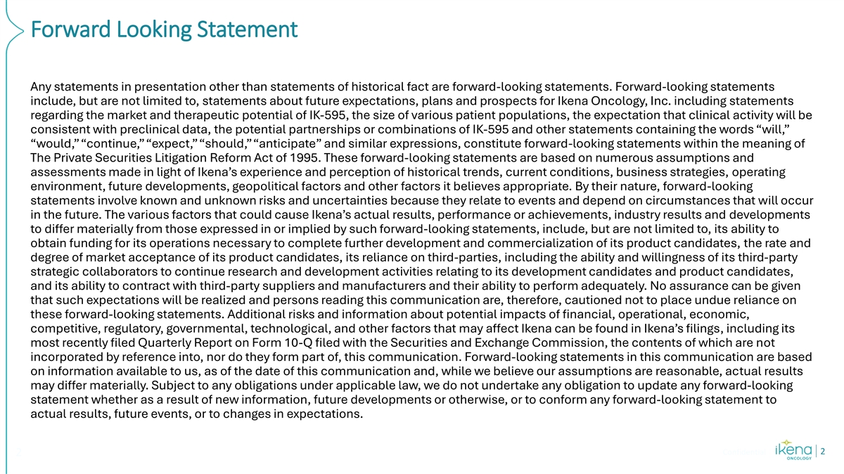 Forward Looking Statement Any statements in presentation other than statements of historical fact are forward-looking statements. Forward-looking statements include, but are not limited to, statements about future expectations, plans and prospects for Ikena Oncology, Inc. including statements regarding the market and therapeutic potential of IK-595, the size of various patient populations, the expectation that clinical activity will be consistent with preclinical data, the potential partnerships or combinations of IK-595 and other statements containing the words “will,” “would,” “continue,” “expect,” “should,” “anticipate” and similar expressions, constitute forward-looking statements within the meaning of The Private Securities Litigation Reform Act of 1995. These forward-looking statements are based on numerous assumptions and assessments made in light of Ikena’s experience and perception of historical trends, current conditions, business strategies, operating environment, future developments, geopolitical factors and other factors it believes appropriate. By their nature, forward-looking statements involve known and unknown risks and uncertainties because they relate to events and depend on circumstances that will occur in the future. The various factors that could cause Ikena’s actual results, performance or achievements, industry results and developments to differ materially from those expressed in or implied by such forward-looking statements, include, but are not limited to, its ability to obtain funding for its operations necessary to complete further development and commercialization of its product candidates, the rate and degree of market acceptance of its product candidates, its reliance on third-parties, including the ability and willingness of its third-party strategic collaborators to continue research and development activities relating to its development candidates and product candidates, and its ability to contract with third-party suppliers and manufacturers and their ability to perform adequately. No assurance can be given that such expectations will be realized and persons reading this communication are, therefore, cautioned not to place undue reliance on these forward-looking statements. Additional risks and information about potential impacts of financial, operational, economic, competitive, regulatory, governmental, technological, and other factors that may affect Ikena can be found in Ikena’s filings, including its most recently filed Quarterly Report on Form 10-Q filed with the Securities and Exchange Commission, the contents of which are not incorporated by reference into, nor do they form part of, this communication. Forward-looking statements in this communication are based on information available to us, as of the date of this communication and, while we believe our assumptions are reasonable, actual results may differ materially. Subject to any obligations under applicable law, we do not undertake any obligation to update any forward-looking statement whether as a result of new information, future developments or otherwise, or to conform any forward-looking statement to actual results, future events, or to changes in expectations. Confidential 2 2