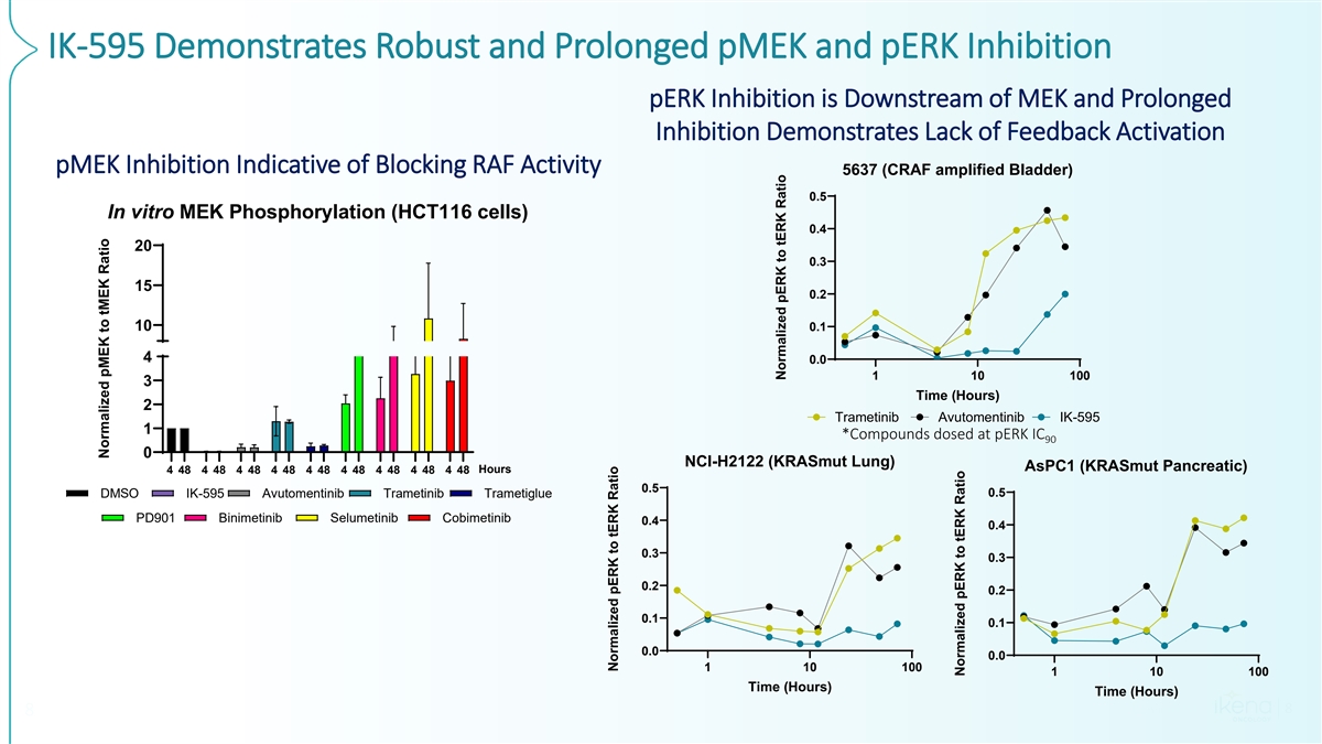 IK-595 Stabilized MEK-CRAF, MEK-BRAF, and MEK-ARAF Complexes in Cells Mass spectrometry characterization of MEK/RAF interactions ND: Not detected 4 3 2 1 0 Compounds treated at IC 90 IK-595 also stabilized Class I, II and III BRAF mutant proteins in inactive complex with MEK Confidential 7 7 DMSO Trametinib VS-6766 Trametiglue IK-595 CRAF-MEK Interaction (Fold Induction)