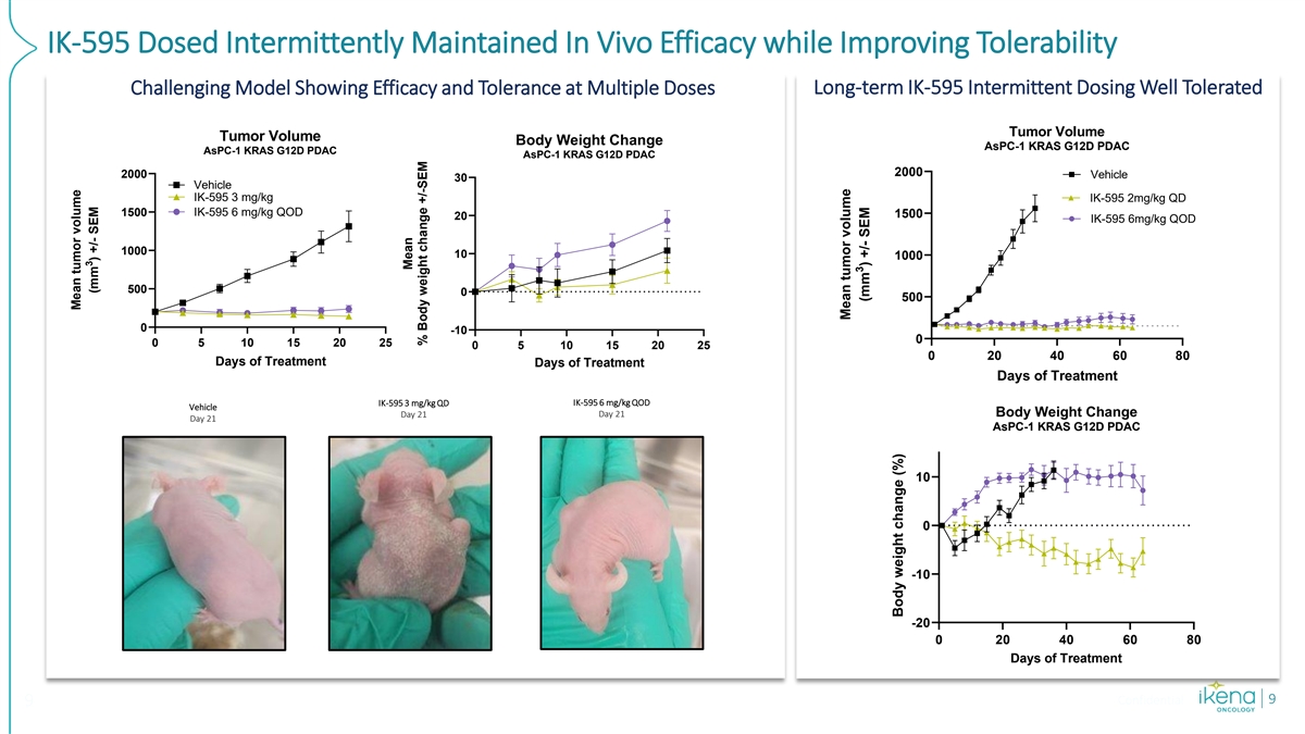 IK-595 Dosed Intermittently Maintained In Vivo Efficacy while Improving Tolerability Long-term IK-595 Intermittent Dosing Well Tolerated Challenging Model Showing Efficacy and Tolerance at Multiple Doses Tumor Volume Tumor Volume Body Weight Change AsPC-1 KRAS G12D PDAC AsPC-1 KRAS G12D PDAC AsPC-1 KRAS G12D PDAC 2000 2000 Vehicle 30 Vehicle IK-595 3 mg/kg IK-595 2mg/kg QD 1500 IK-595 6 mg/kg QOD 1500 20 IK-595 6mg/kg QOD 1000 10 1000 500 0 500 0 -10 0 0 5 10 15 20 25 0 5 10 15 20 25 0 20 40 60 80 Days of Treatment Days of Treatment Days of Treatment IK-595 3 mg/kg QD IK-595 6 mg/kg QOD Vehicle Day 21 Day 21 Body Weight Change Day 21 AsPC-1 KRAS G12D PDAC 10 0 -10 -20 0 20 40 60 80 Days of Treatment Confidential 9 9 Mean tumor volume 3 (mm ) +/- SEM Mean % Body weight change +/-SEM Mean tumor volume 3 (mm ) +/- SEM Body weight change (%)