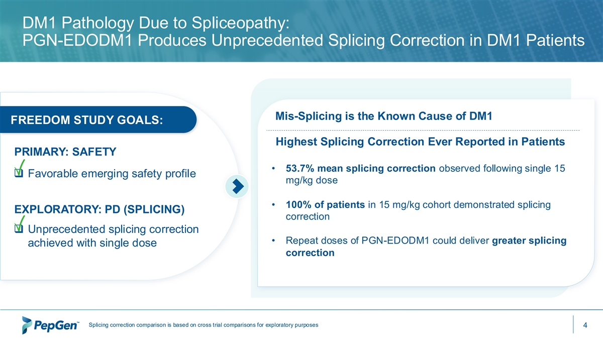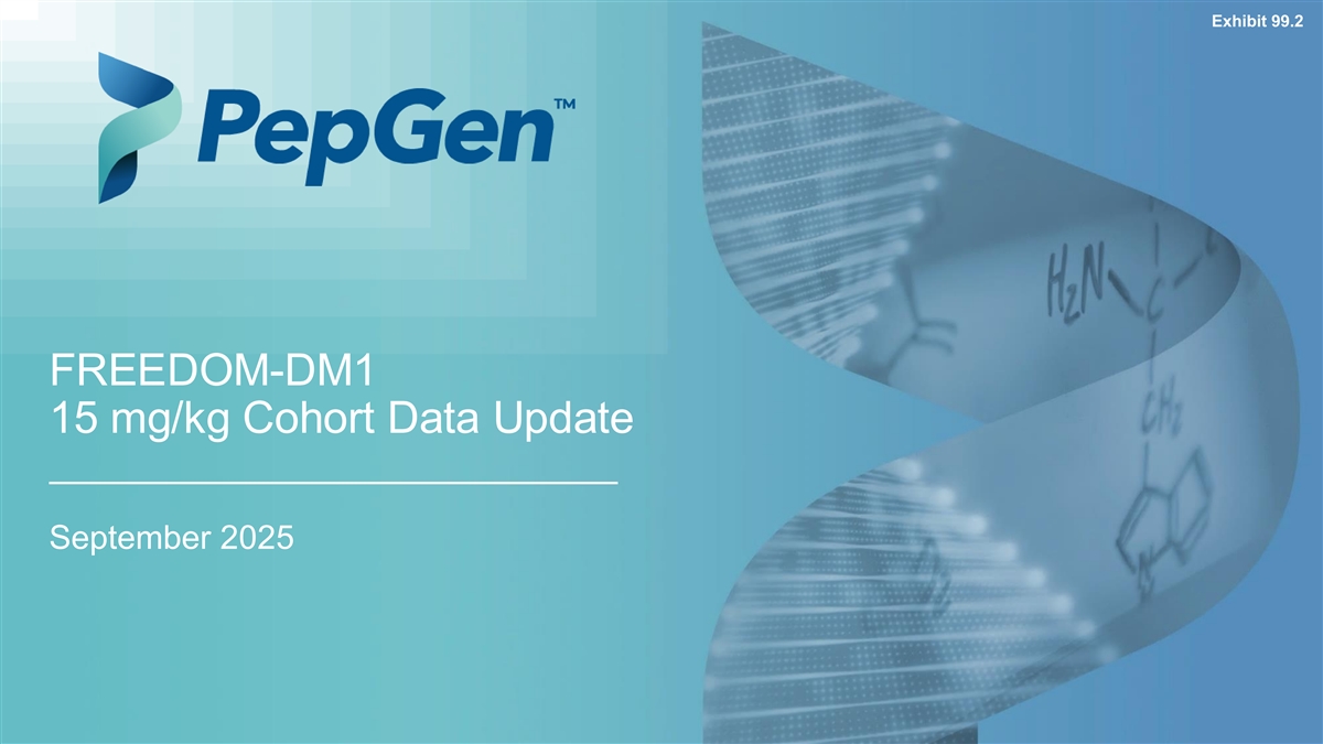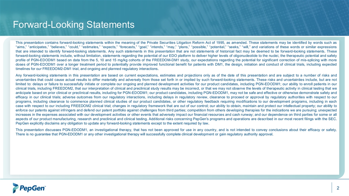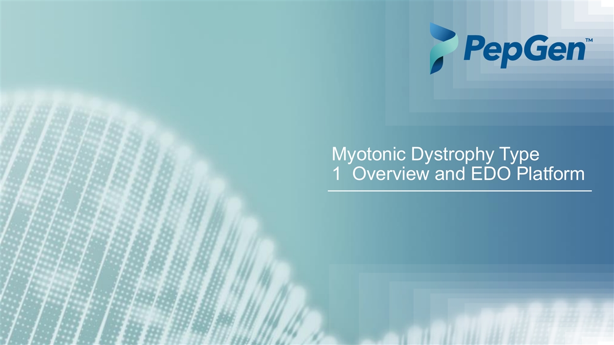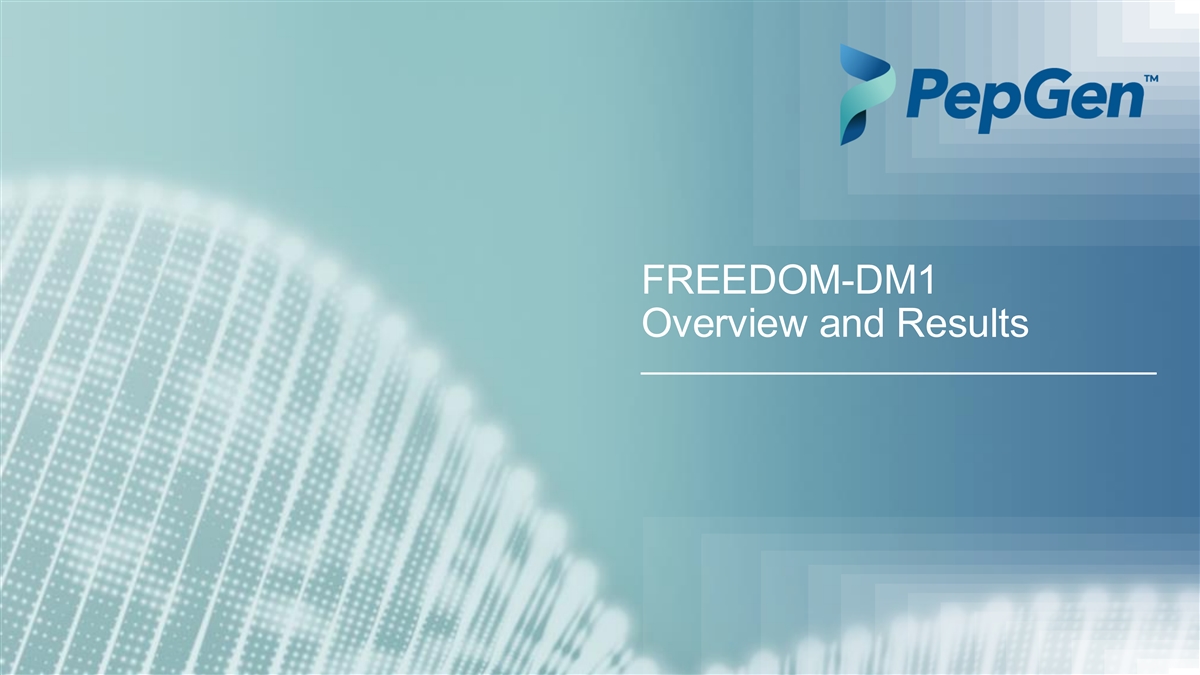 Forward-Looking Statements This presentation contains forward-looking statements within the meaning of the Private Securities Litigation Reform Act of 1995, as amended. These statements may be identified by words such as “aims,” “anticipates,” “believes,” “could,” “estimates,” “expects,” “forecasts,” “goal,” “intends,” “may,” “plans,” “possible,” “potential,” “seeks,” “will,” and variations of these words or similar expressions that are intended to identify forward-looking statements. Any such statements in this presentation that are not statements of historical fact may be deemed to be forward-looking statements. These forward-looking statements include, without limitation, statements regarding the potential of our EDO platform to deliver higher levels of oligonucleotide to the nuclei, the therapeutic potential and safety profile of PGN-EDODM1 based on data from the 5, 10 and 15 mg/kg cohorts of the FREEDOM-DM1 study, our expectations regarding the potential for significant correction of mis-splicing with more doses of PGN-EDODM1 over a longer treatment period to potentially provide improved functional benefit for patients with DM1, the design, initiation and conduct of clinical trials, including expected timelines for our FREEDOM2-DM1 trial, and ongoing and planned regulatory interactions. Any forward-looking statements in this presentation are based on current expectations, estimates and projections only as of the date of this presentation and are subject to a number of risks and uncertainties that could cause actual results to differ materially and adversely from those set forth in or implied by such forward-looking statements. These risks and uncertainties include, but are not limited to: delays or failure to successfully initiate or complete our ongoing and planned development activities for our product candidates, including PGN-EDODM1; our ability to enroll patients in our clinical trials, including FREEDOM2, that our interpretation of clinical and preclinical study results may be incorrect, or that we may not observe the levels of therapeutic activity in clinical testing that we anticipate based on prior clinical or preclinical results, including for PGN-EDODM1; our product candidates, including PGN-EDODM1, may not be safe and effective or otherwise demonstrate safety and efficacy in our clinical trials; adverse outcomes from our regulatory interactions, including delays in regulatory review, clearance to proceed or approval by regulatory authorities with respect to our programs, including clearance to commence planned clinical studies of our product candidates, or other regulatory feedback requiring modifications to our development programs, including in each case with respect to our including FREEDOM2 clinical trial; changes in regulatory framework that are out of our control; our ability to obtain, maintain and protect our intellectual property; our ability to enforce our patents against infringers and defend our patent portfolio against challenges from third parties; competition from others developing therapies for the indications we are pursuing; unexpected increases in the expenses associated with our development activities or other events that adversely impact our financial resources and cash runway; and our dependence on third parties for some or all aspects of our product manufacturing, research and preclinical and clinical testing. Additional risks concerning PepGen's programs and operations are described in our most recent filings with the SEC. PepGen explicitly disclaims any obligation to update any forward-looking statements except to the extent required by law. This presentation discusses PGN-EDODM1, an investigational therapy, that has not been approved for use in any country, and is not intended to convey conclusions about their efficacy or safety. There is no guarantee that PGN-EDODM1 or any other investigational therapy will successfully complete clinical development or gain regulatory authority approval. 2