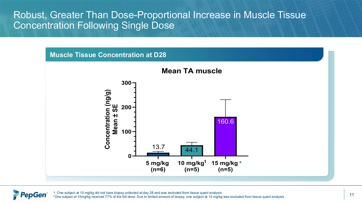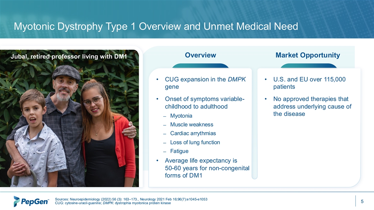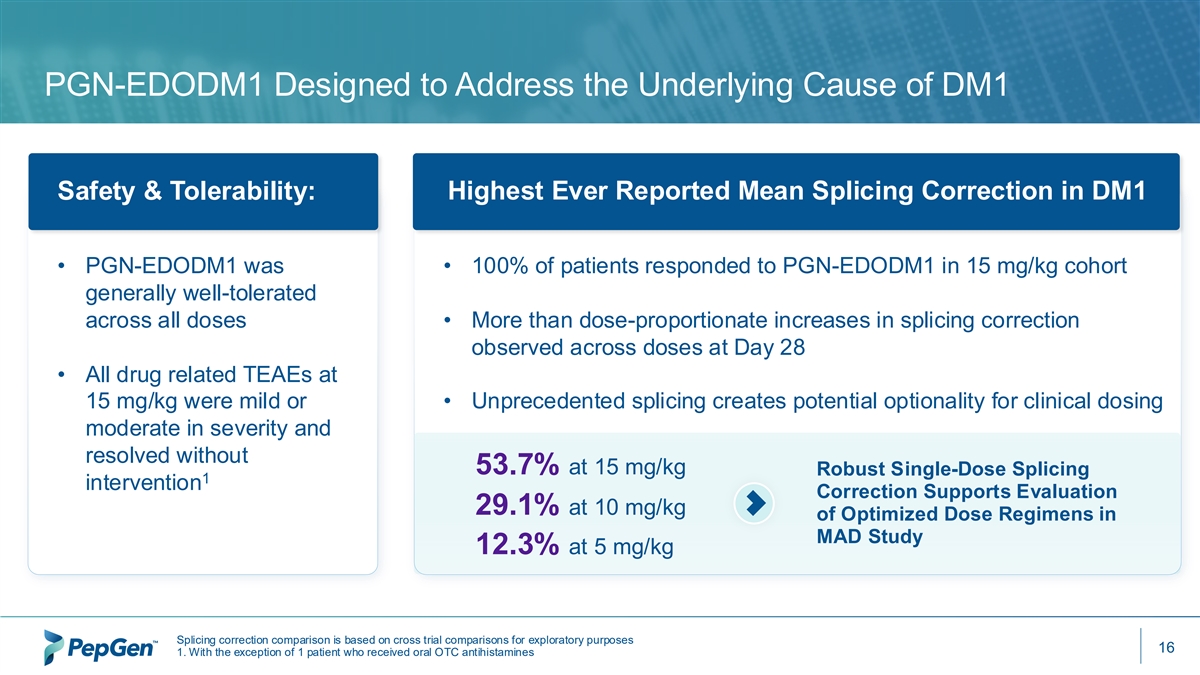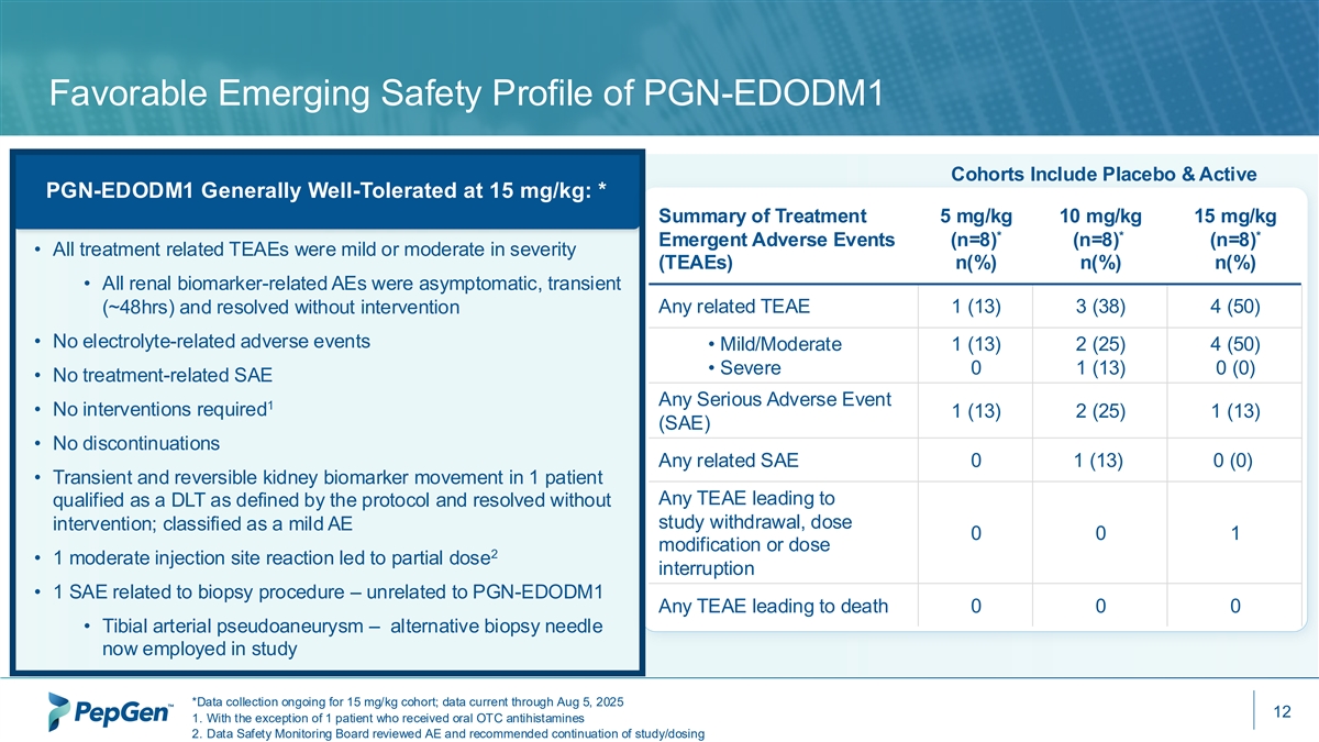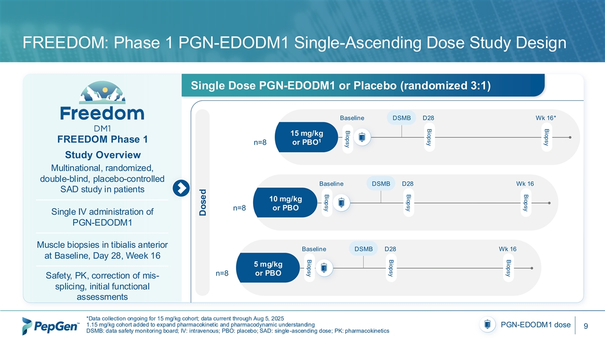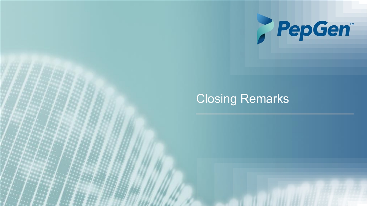 Forward-Looking Statements This presentation contains forward-looking statements within the meaning of the Private Securities Litigation Reform Act of 1995, as amended. These statements may be identified by words such as “aims,” “anticipates,” “believes,” “could,” “estimates,” “expects,” “forecasts,” “goal,” “intends,” “may,” “plans,” “possible,” “potential,” “seeks,” “will,” and variations of these words or similar expressions that are intended to identify forward-looking statements. Any such statements in this presentation that are not statements of historical fact may be deemed to be forward-looking statements. These forward-looking statements include, without limitation, statements regarding the potential of our EDO platform to deliver higher levels of oligonucleotide to the nuclei, the therapeutic potential and safety profile of PGN-EDODM1 based on data from the 5, 10 and 15 mg/kg cohorts of the FREEDOM-DM1 study, our expectations regarding the potential for significant correction of mis-splicing with more doses of PGN-EDODM1 over a longer treatment period to potentially provide improved functional benefit for patients with DM1, the design, initiation and conduct of clinical trials, including expected timelines for our FREEDOM2-DM1 trial, and ongoing and planned regulatory interactions. Any forward-looking statements in this presentation are based on current expectations, estimates and projections only as of the date of this presentation and are subject to a number of risks and uncertainties that could cause actual results to differ materially and adversely from those set forth in or implied by such forward-looking statements. These risks and uncertainties include, but are not limited to: delays or failure to successfully initiate or complete our ongoing and planned development activities for our product candidates, including PGN-EDODM1; our ability to enroll patients in our clinical trials, including FREEDOM2, that our interpretation of clinical and preclinical study results may be incorrect, or that we may not observe the levels of therapeutic activity in clinical testing that we anticipate based on prior clinical or preclinical results, including for PGN-EDODM1; our product candidates, including PGN-EDODM1, may not be safe and effective or otherwise demonstrate safety and efficacy in our clinical trials; adverse outcomes from our regulatory interactions, including delays in regulatory review, clearance to proceed or approval by regulatory authorities with respect to our programs, including clearance to commence planned clinical studies of our product candidates, or other regulatory feedback requiring modifications to our development programs, including in each case with respect to our including FREEDOM2 clinical trial; changes in regulatory framework that are out of our control; our ability to obtain, maintain and protect our intellectual property; our ability to enforce our patents against infringers and defend our patent portfolio against challenges from third parties; competition from others developing therapies for the indications we are pursuing; unexpected increases in the expenses associated with our development activities or other events that adversely impact our financial resources and cash runway; and our dependence on third parties for some or all aspects of our product manufacturing, research and preclinical and clinical testing. Additional risks concerning PepGen's programs and operations are described in our most recent filings with the SEC. PepGen explicitly disclaims any obligation to update any forward-looking statements except to the extent required by law. This presentation discusses PGN-EDODM1, an investigational therapy, that has not been approved for use in any country, and is not intended to convey conclusions about their efficacy or safety. There is no guarantee that PGN-EDODM1 or any other investigational therapy will successfully complete clinical development or gain regulatory authority approval. 2