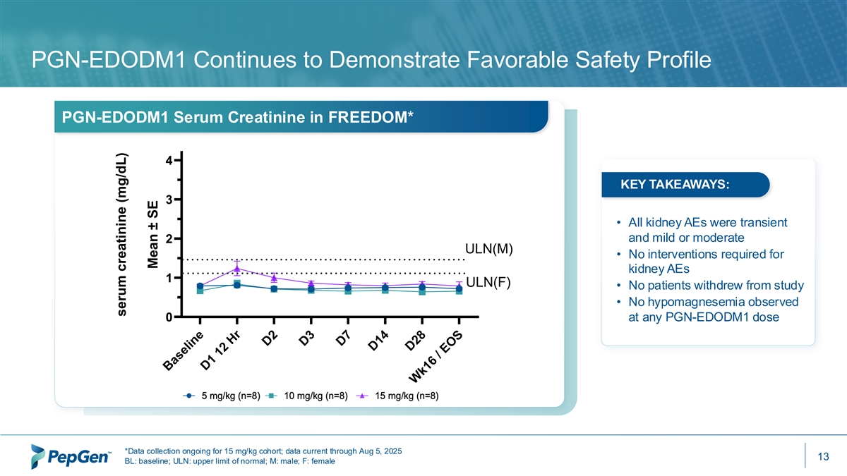 Favorable Emerging Safety Profile of PGN-EDODM1 Cohorts Include Placebo & Active PGN-EDODM1 Generally Well-Tolerated at 15 mg/kg: * Summary of Treatment 5 mg/kg 10 mg/kg 15 mg/kg * * * 1 Emergent Adverse Events (n=8) (n=8) (n=8) • All treatment related TEAEs were mild or moderate in severity (TEAEs) n(%) n(%) n(%) • All renal biomarker-related AEs were asymptomatic, transient (~48hrs) and resolved without intervention Any related TEAE 1 (13) 3 (38) 4 (50) • No electrolyte-related adverse events • Mild/Moderate 1 (13) 2 (25) 4 (50) • Severe 0 1 (13) 0 (0) • No treatment-related SAE Any Serious Adverse Event 1 • No interventions required 1 (13) 2 (25) 1 (13) (SAE) • No discontinuations Any related SAE 0 1 (13) 0 (0) • Transient and reversible kidney biomarker movement in 1 patient Any TEAE leading to qualified as a DLT as defined by the protocol and resolved without study withdrawal, dose intervention; classified as a mild AE 0 0 1 modification or dose 2 • 1 moderate injection site reaction led to partial dose interruption • 1 SAE related to biopsy procedure – unrelated to PGN-EDODM1 Any TEAE leading to death 0 0 0 • Tibial arterial pseudoaneurysm – alternative biopsy needle now employed in study *Data collection ongoing for 15 mg/kg cohort; data current through Aug 5, 2025 12 1. With the exception of 1 patient who received oral OTC antihistamines 2. Data Safety Monitoring Board reviewed AE and recommended continuation of study/dosing