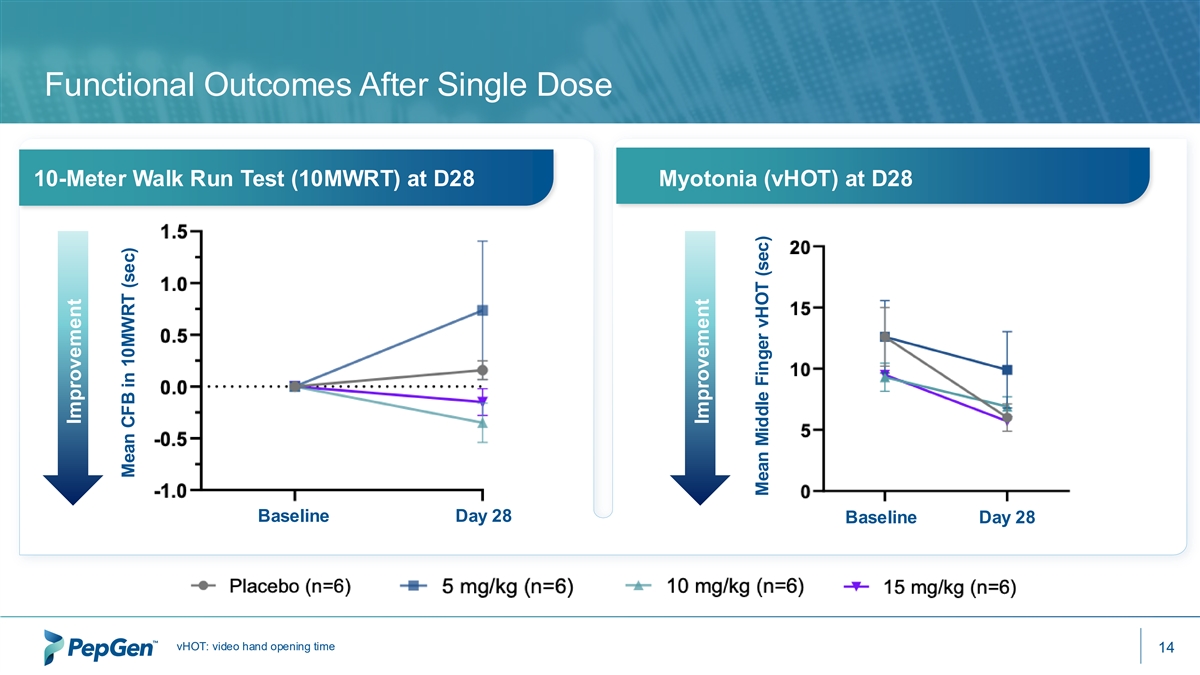 Functional Outcomes After Single Dose 10-Meter Walk Run Test (10MWRT) at D28 Myotonia (vHOT) at D28 Baseline Day 28 Baseline Day 28 vHOT: video hand opening time 14 Improvement Mean CFB in 10MWRT (sec) Improvement Mean Middle Finger vHOT (sec)