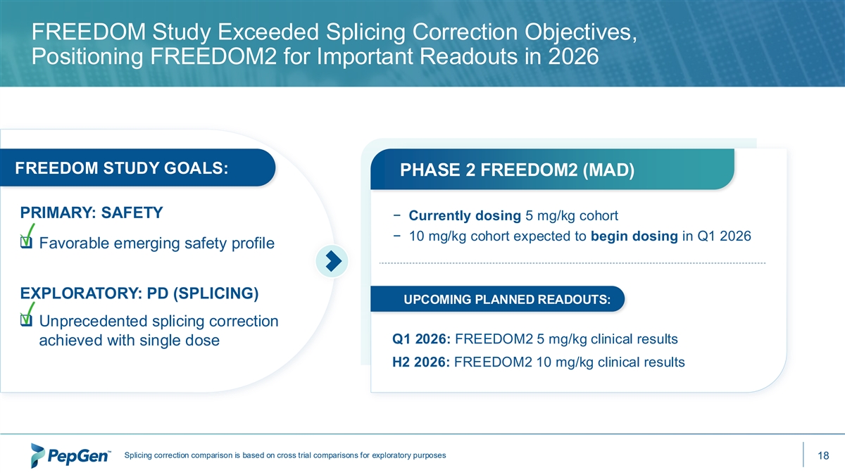 FREEDOM Study Exceeded Splicing Correction Objectives, Positioning FREEDOM2 for Important Readouts in 2026 FREEDOM STUDY GOALS: PHASE 2 FREEDOM2 (MAD) PRIMARY: SAFETY − Currently dosing 5 mg/kg cohort − 10 mg/kg cohort expected to begin dosing in Q1 2026 ❑ Favorable emerging safety profile EXPLORATORY: PD (SPLICING) UPCOMING PLANNED READOUTS: ❑ Unprecedented splicing correction Q1 2026: FREEDOM2 5 mg/kg clinical results achieved with single dose H2 2026: FREEDOM2 10 mg/kg clinical results Splicing correction comparison is based on cross trial comparisons for exploratory purposes 18