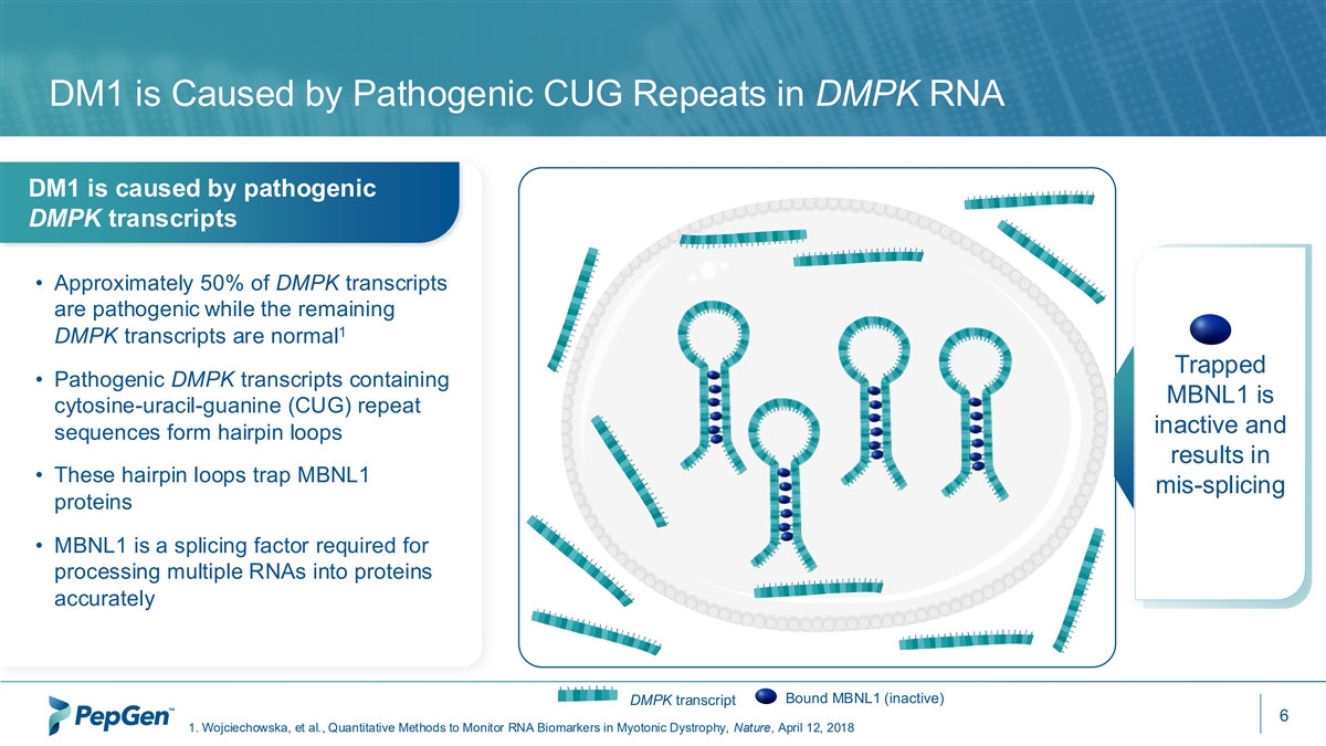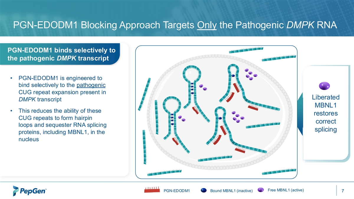 DM1 is Caused by Pathogenic CUG Repeats in DMPK RNA DM1 is caused by pathogenic DMPK transcripts • Approximately 50% of DMPK transcripts are pathogenic while the remaining 1 DMPK transcripts are normal Trapped • Pathogenic DMPK transcripts containing MBNL1 is cytosine-uracil-guanine (CUG) repeat inactive and sequences form hairpin loops results in • These hairpin loops trap MBNL1 mis-splicing proteins • MBNL1 is a splicing factor required for processing multiple RNAs into proteins accurately Bound MBNL1 (inactive) DMPK transcript 6 1. Wojciechowska, et al., Quantitative Methods to Monitor RNA Biomarkers in Myotonic Dystrophy, Nature, April 12, 2018
