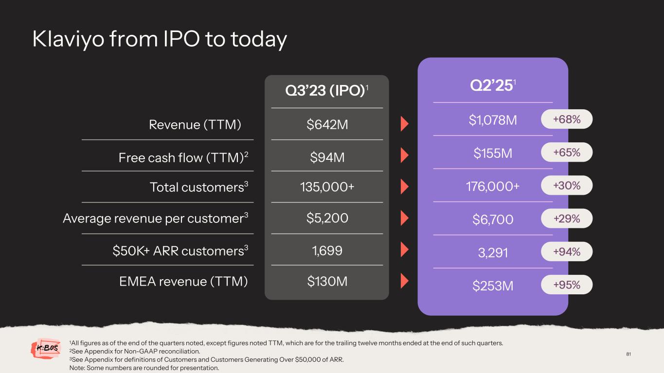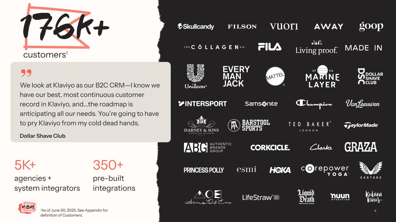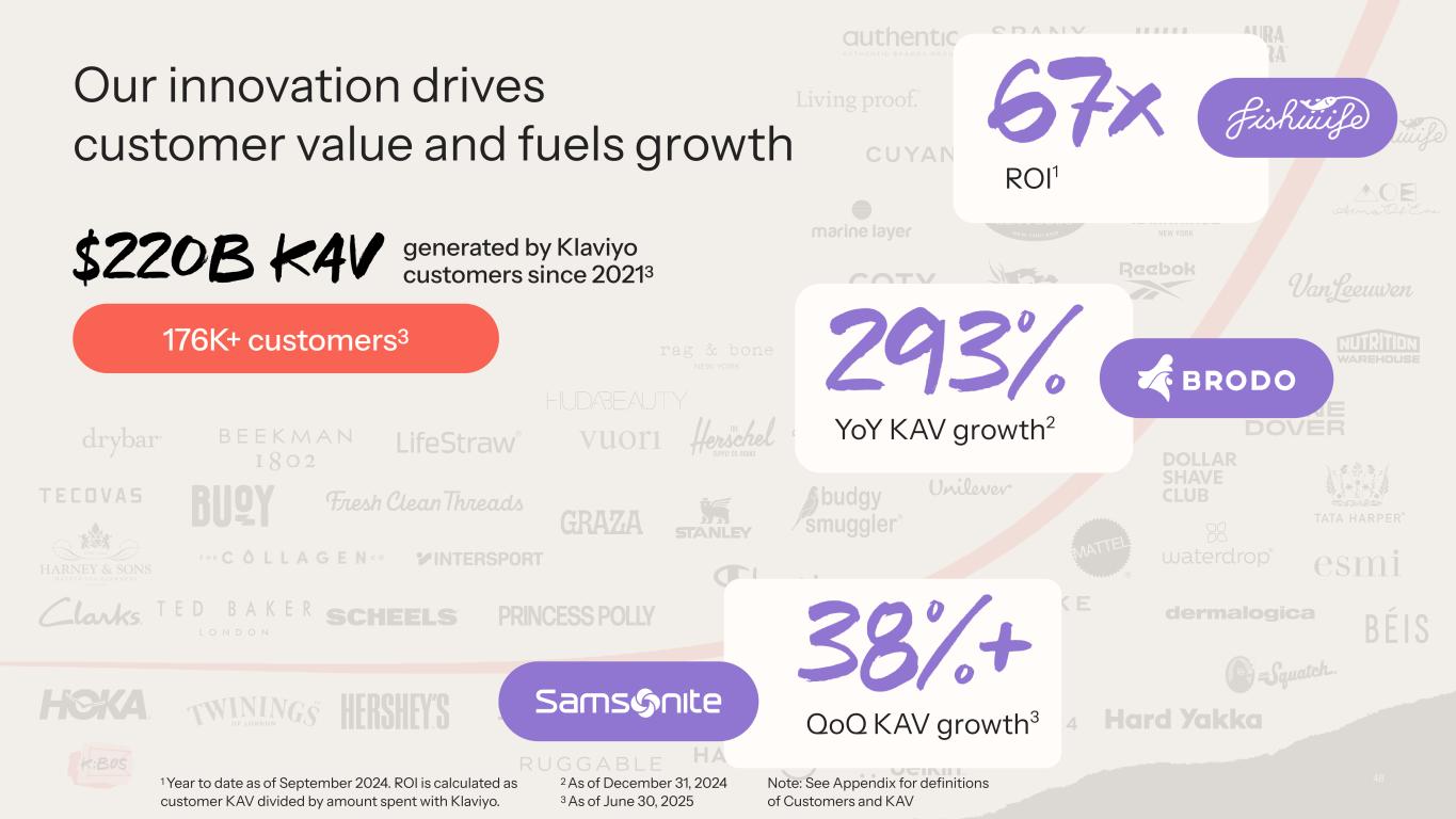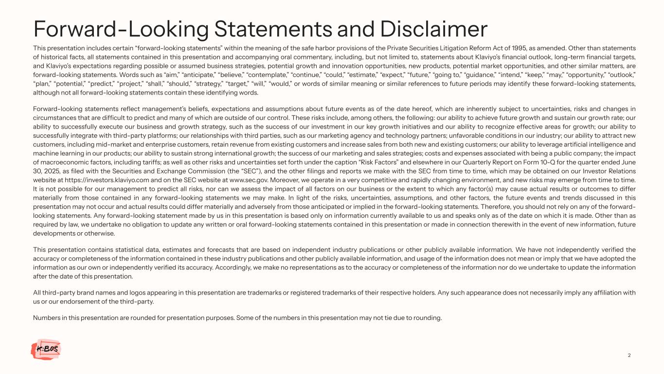 2 Forward-Looking Statements and Disclaimer This presentation includes certain “forward-looking statements” within the meaning of the safe harbor provisions of the Private Securities Litigation Reform Act of 1995, as amended. Other than statements of historical facts, all statements contained in this presentation and accompanying oral commentary, including, but not limited to, statements about Klaviyo’s financial outlook, long-term financial targets, and Klaviyo’s expectations regarding possible or assumed business strategies, potential growth and innovation opportunities, new products, potential market opportunities, and other similar matters, are forward-looking statements. Words such as “aim,” “anticipate,” “believe,” “contemplate,” “continue,” “could,” “estimate,” “expect,” “future,” “going to,” “guidance,” “intend,” “keep,” “may,” “opportunity,” “outlook,” “plan,” “potential,” “predict,” “project,” “shall,” “should,” “strategy,” “target,” “will,” “would,” or words of similar meaning or similar references to future periods may identify these forward-looking statements, although not all forward-looking statements contain these identifying words. Forward-looking statements reflect management’s beliefs, expectations and assumptions about future events as of the date hereof, which are inherently subject to uncertainties, risks and changes in circumstances that are difficult to predict and many of which are outside of our control. These risks include, among others, the following: our ability to achieve future growth and sustain our growth rate; our ability to successfully execute our business and growth strategy, such as the success of our investment in our key growth initiatives and our ability to recognize effective areas for growth; our ability to successfully integrate with third-party platforms; our relationships with third parties, such as our marketing agency and technology partners; unfavorable conditions in our industry; our ability to attract new customers, including mid-market and enterprise customers, retain revenue from existing customers and increase sales from both new and existing customers; our ability to leverage artificial intelligence and machine learning in our products; our ability to sustain strong international growth; the success of our marketing and sales strategies; costs and expenses associated with being a public company; the impact of macroeconomic factors, including tariffs; as well as other risks and uncertainties set forth under the caption “Risk Factors” and elsewhere in our Quarterly Report on Form 10-Q for the quarter ended June 30, 2025, as filed with the Securities and Exchange Commission (the “SEC”), and the other filings and reports we make with the SEC from time to time, which may be obtained on our Investor Relations website at https://investors.klaviyo.com and on the SEC website at www.sec.gov. Moreover, we operate in a very competitive and rapidly changing environment, and new risks may emerge from time to time. It is not possible for our management to predict all risks, nor can we assess the impact of all factors on our business or the extent to which any factor(s) may cause actual results or outcomes to differ materially from those contained in any forward-looking statements we may make. In light of the risks, uncertainties, assumptions, and other factors, the future events and trends discussed in this presentation may not occur and actual results could differ materially and adversely from those anticipated or implied in the forward-looking statements. Therefore, you should not rely on any of the forward- looking statements. Any forward-looking statement made by us in this presentation is based only on information currently available to us and speaks only as of the date on which it is made. Other than as required by law, we undertake no obligation to update any written or oral forward-looking statements contained in this presentation or made in connection therewith in the event of new information, future developments or otherwise. This presentation contains statistical data, estimates and forecasts that are based on independent industry publications or other publicly available information. We have not independently verified the accuracy or completeness of the information contained in these industry publications and other publicly available information, and usage of the information does not mean or imply that we have adopted the information as our own or independently verified its accuracy. Accordingly, we make no representations as to the accuracy or completeness of the information nor do we undertake to update the information after the date of this presentation. All third-party brand names and logos appearing in this presentation are trademarks or registered trademarks of their respective holders. Any such appearance does not necessarily imply any affiliation with us or our endorsement of the third-party. Numbers in this presentation are rounded for presentation purposes. Some of the numbers in this presentation may not tie due to rounding.