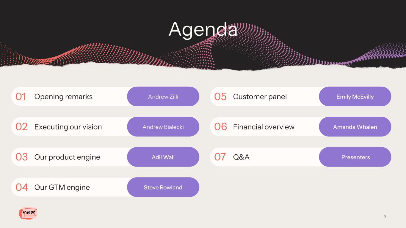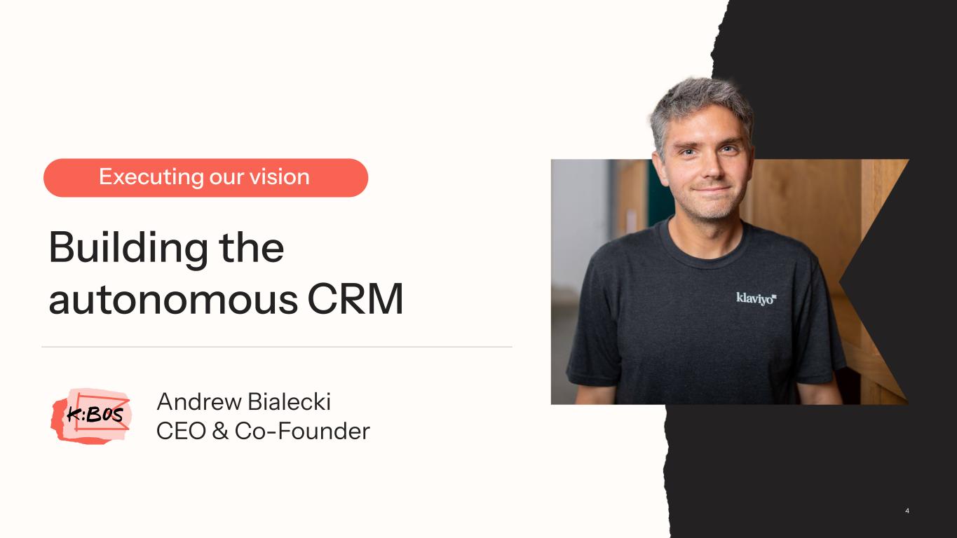 2025 © Klaviyo Agenda 3 Opening remarks Andrew Zilli01 Financial overview Amanda Whalen06 Q&A Presenters07 Customer panel Emily McEvilly05 Executing our vision Andrew Bialecki02 Our product engine Adil Wali03 Our GTM engine Steve Rowland04