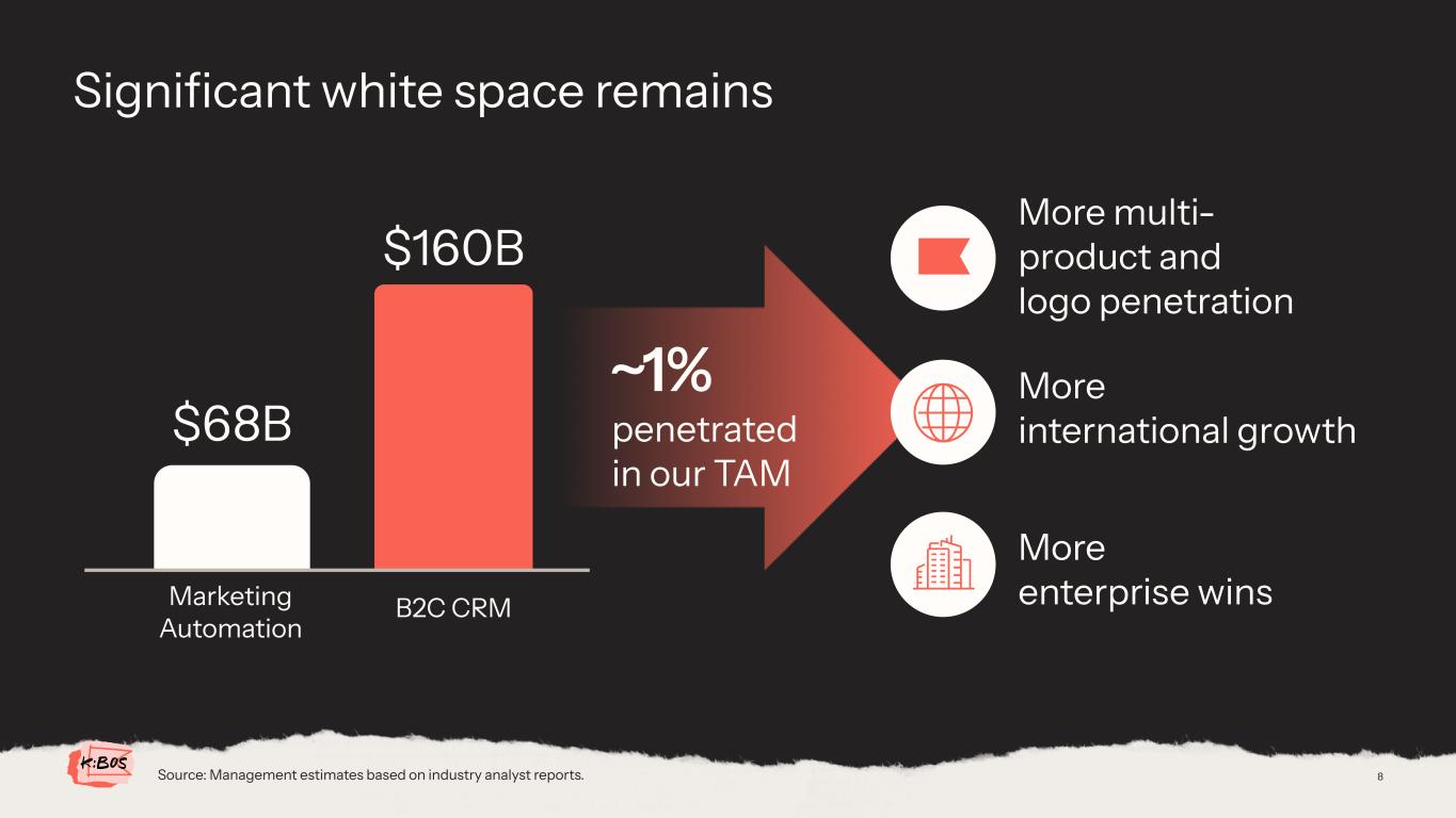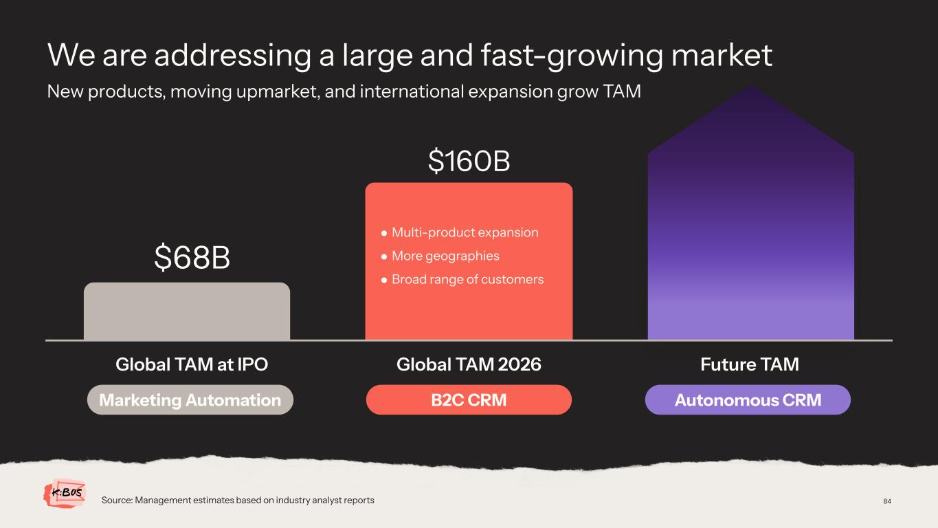 84 $68B Global TAM at IPO We are addressing a large and fast-growing market Global TAM 2026 Future TAM $160B New products, moving upmarket, and international expansion grow TAM Source: Management estimates based on industry analyst reports Marketing Automation B2C CRM Autonomous CRM ● Multi-product expansion ● More geographies ● Broad range of customers