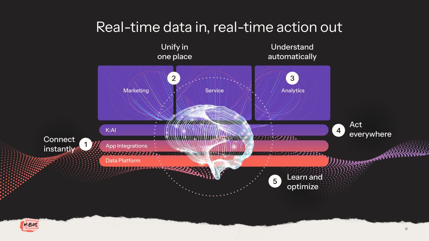 12 Learn and optimize 5 Real-time data in, real-time action out Connect instantly 1 Unify in one place 2 4 Act everywhere 3 Understand automatically Marketing Service Analytics Data Platform App Integrations K:AI