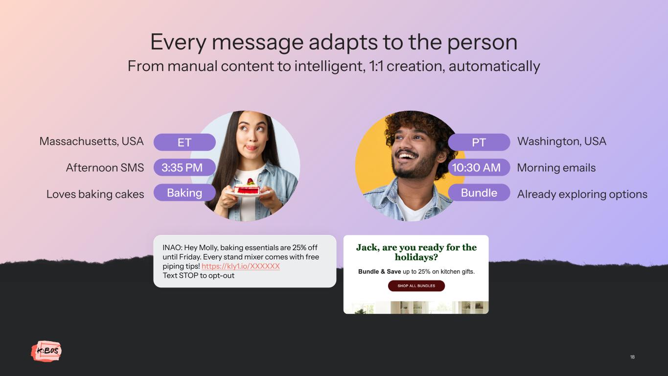 18 Massachusetts, USA Afternoon SMS Loves baking cakes Every message adapts to the person Washington, USA Morning emails Already exploring options ET 3:35 PM Baking PT INAO: Hey Molly, baking essentials are 25% off until Friday. Every stand mixer comes with free piping tips! https://kly1.io/XXXXXX Text STOP to opt-out 10:30 AM Bundle From manual content to intelligent, 1:1 creation, automatically