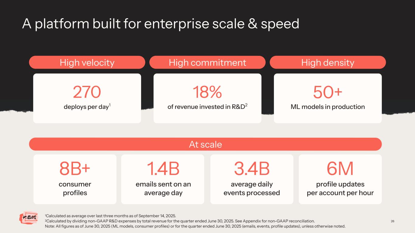 26 6M profile updates per account per hour 270 deploys per day1 High velocity 18% of revenue invested in R&D2 50+ ML models in production High densityHigh commitment At scale 3.4B average daily events processed 1.4B emails sent on an average day 8B+ consumer profiles 1Calculated as average over last three months as of September 14, 2025. 2Calculated by dividing non-GAAP R&D expenses by total revenue for the quarter ended June 30, 2025. See Appendix for non-GAAP reconciliation. Note: All figures as of June 30, 2025 (ML models, consumer profiles) or for the quarter ended June 30, 2025 (emails, events, profile updates), unless otherwise noted. A platform built for enterprise scale & speed