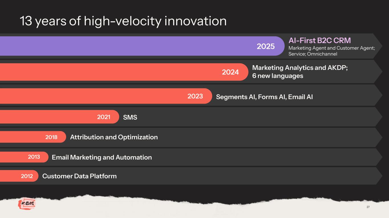 27 13 years of high-velocity innovation 2018 2021 2023 2024 AI-First B2C CRM Marketing Agent and Customer Agent; Service; Omnichannel 2025 Marketing Analytics and AKDP; 6 new languages Segments AI, Forms AI, Email AI SMS Attribution and Optimization Email Marketing and Automation Customer Data Platform2012 2013