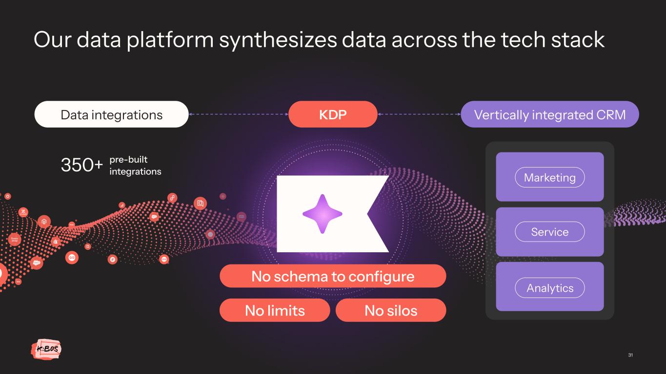 31 Our data platform synthesizes data across the tech stack 350+ pre-built integrations Data integrations KDP Vertically integrated CRM No silos No schema to configure No limits Marketing Analytics Service