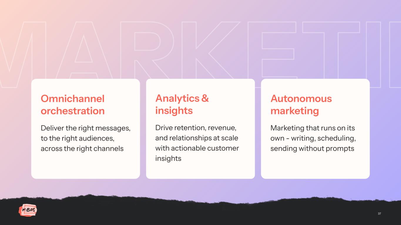 2025 © Klaviyo 37 Omnichannel orchestration Deliver the right messages, to the right audiences, across the right channels Analytics & insights Drive retention, revenue, and relationships at scale with actionable customer insights Autonomous marketing Marketing that runs on its own - writing, scheduling, sending without prompts