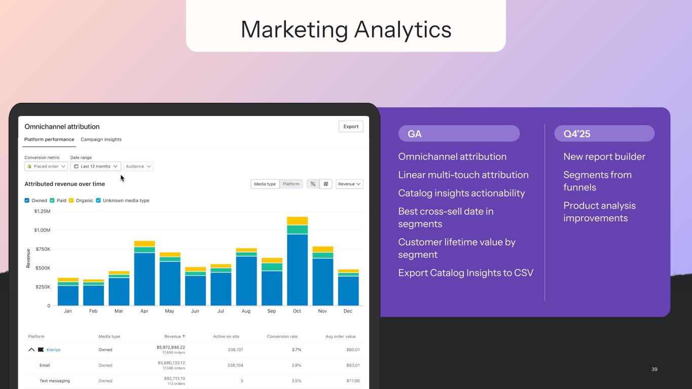 39 GA Omnichannel attribution Linear multi-touch attribution Catalog insights actionability Best cross-sell date in segments Customer lifetime value by segment Export Catalog Insights to CSV Q4’25 New report builder Segments from funnels Product analysis improvements Marketing Analytics