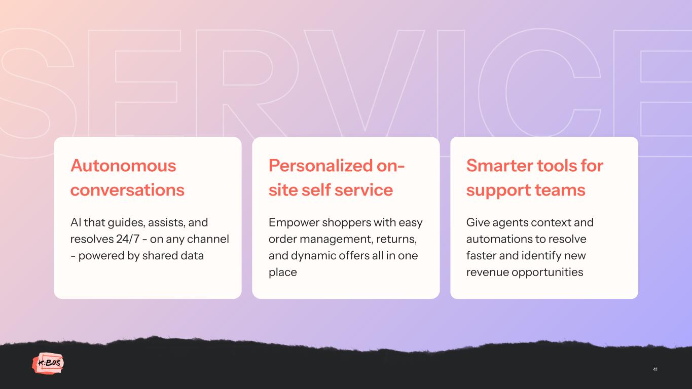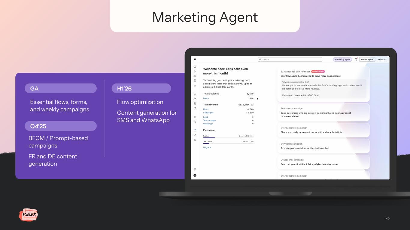 40 Q4’25 BFCM / Prompt-based campaigns FR and DE content generation GA Essential flows, forms, and weekly campaigns H1’26 Flow optimization Content generation for SMS and WhatsApp Marketing Agent