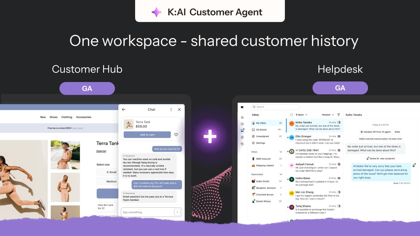 Helpdesk GA + One workspace - shared customer history K:AI Customer Agent Customer Hub GA