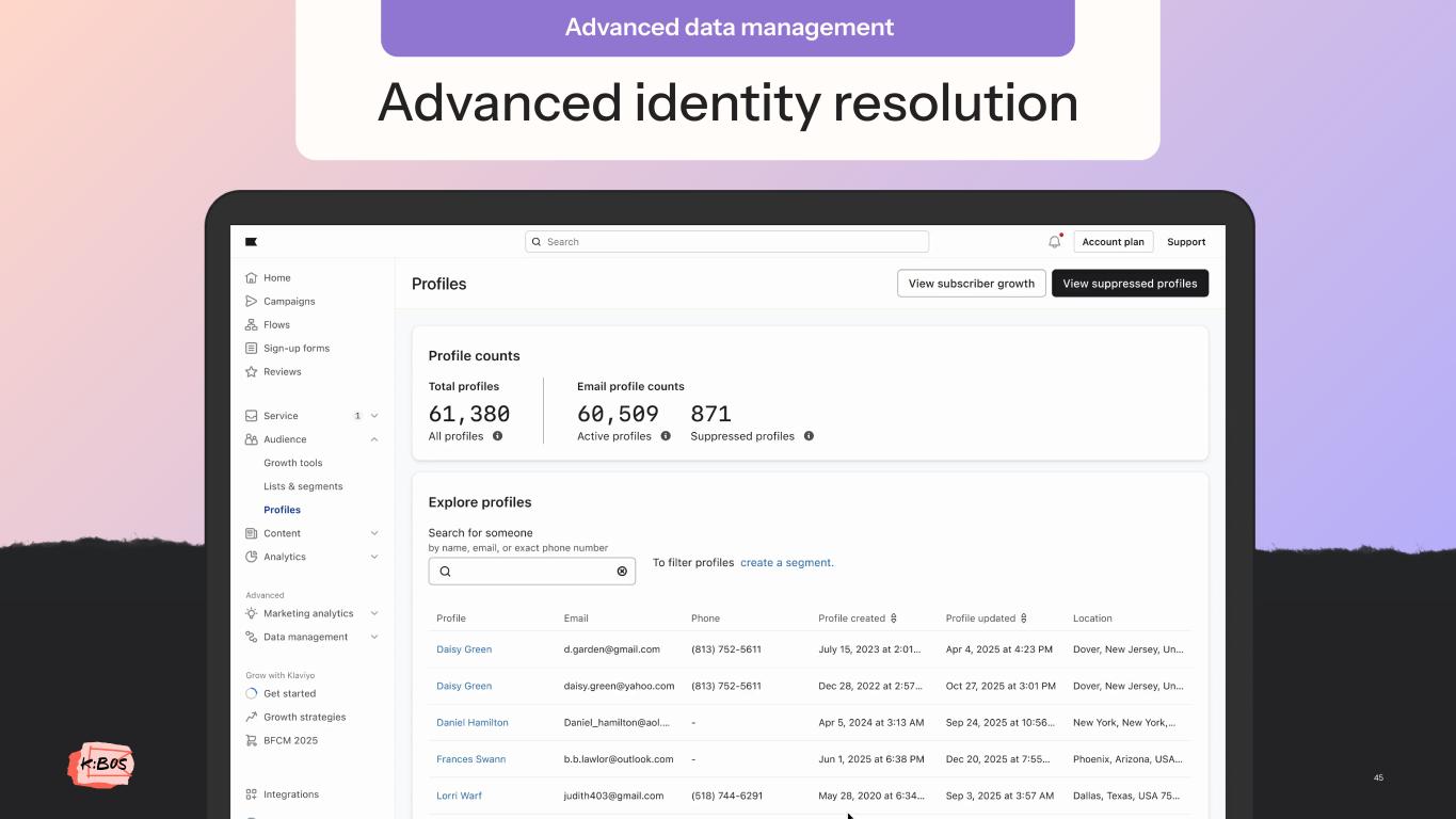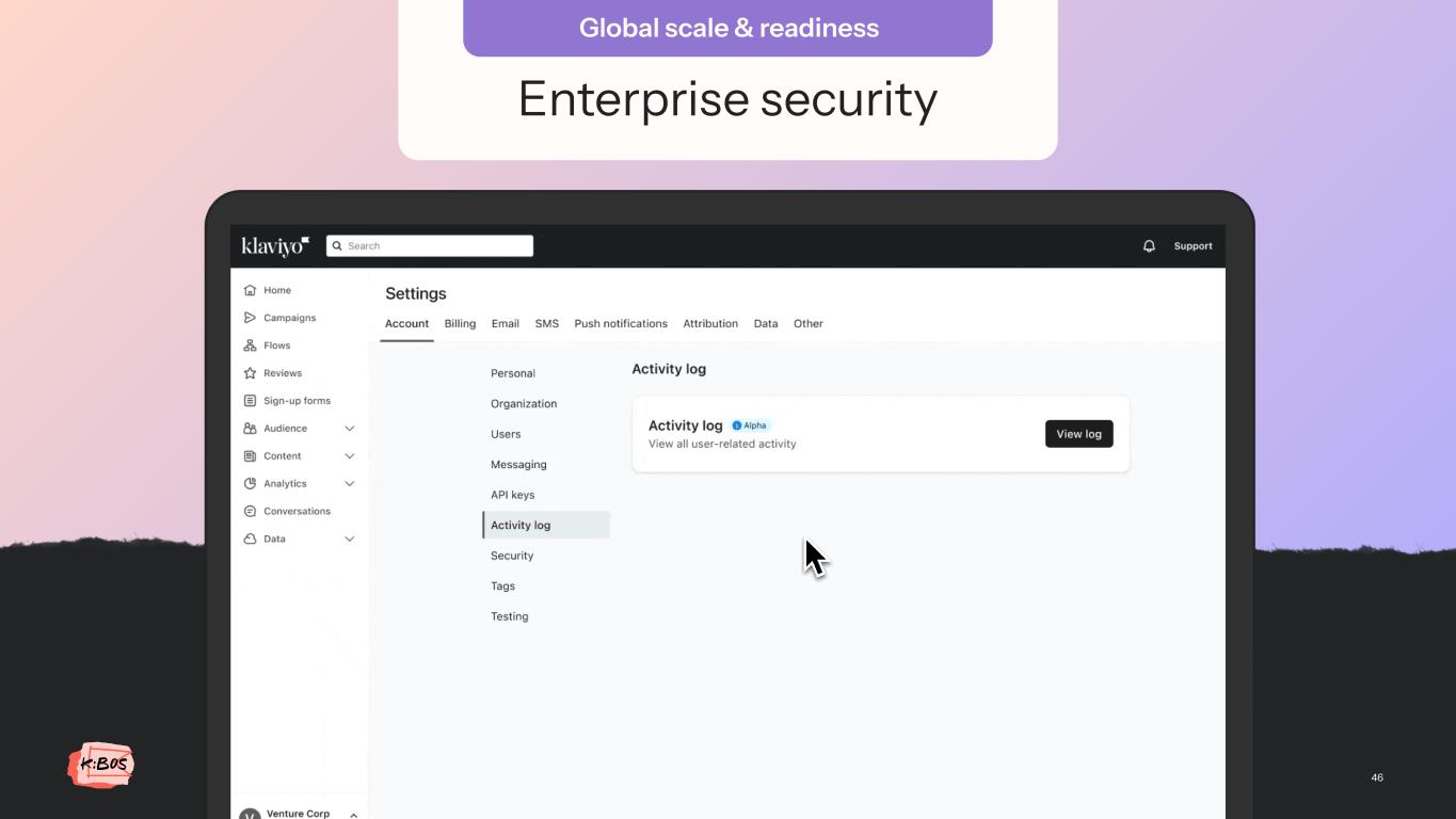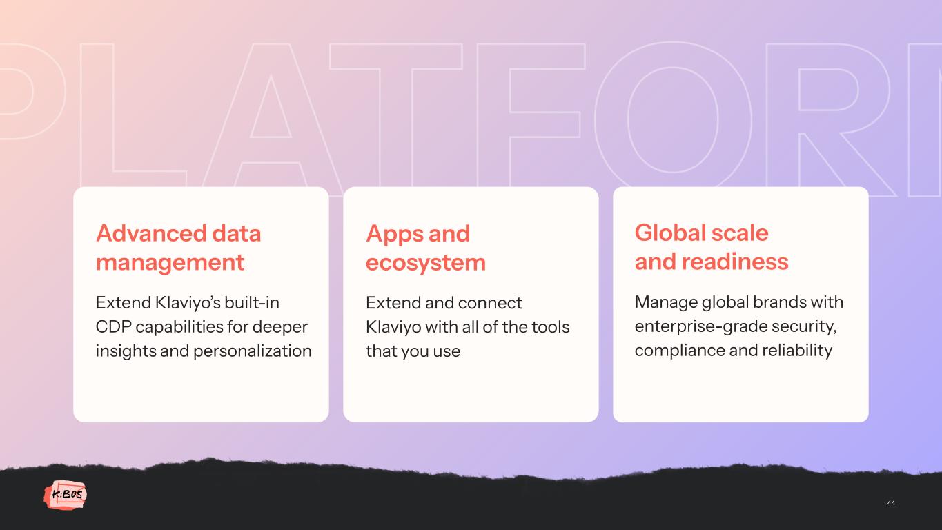 2025 © Klaviyo 44 Advanced data management Extend Klaviyo’s built-in CDP capabilities for deeper insights and personalization Apps and ecosystem Extend and connect Klaviyo with all of the tools that you use Global scale and readiness Manage global brands with enterprise-grade security, compliance and reliability