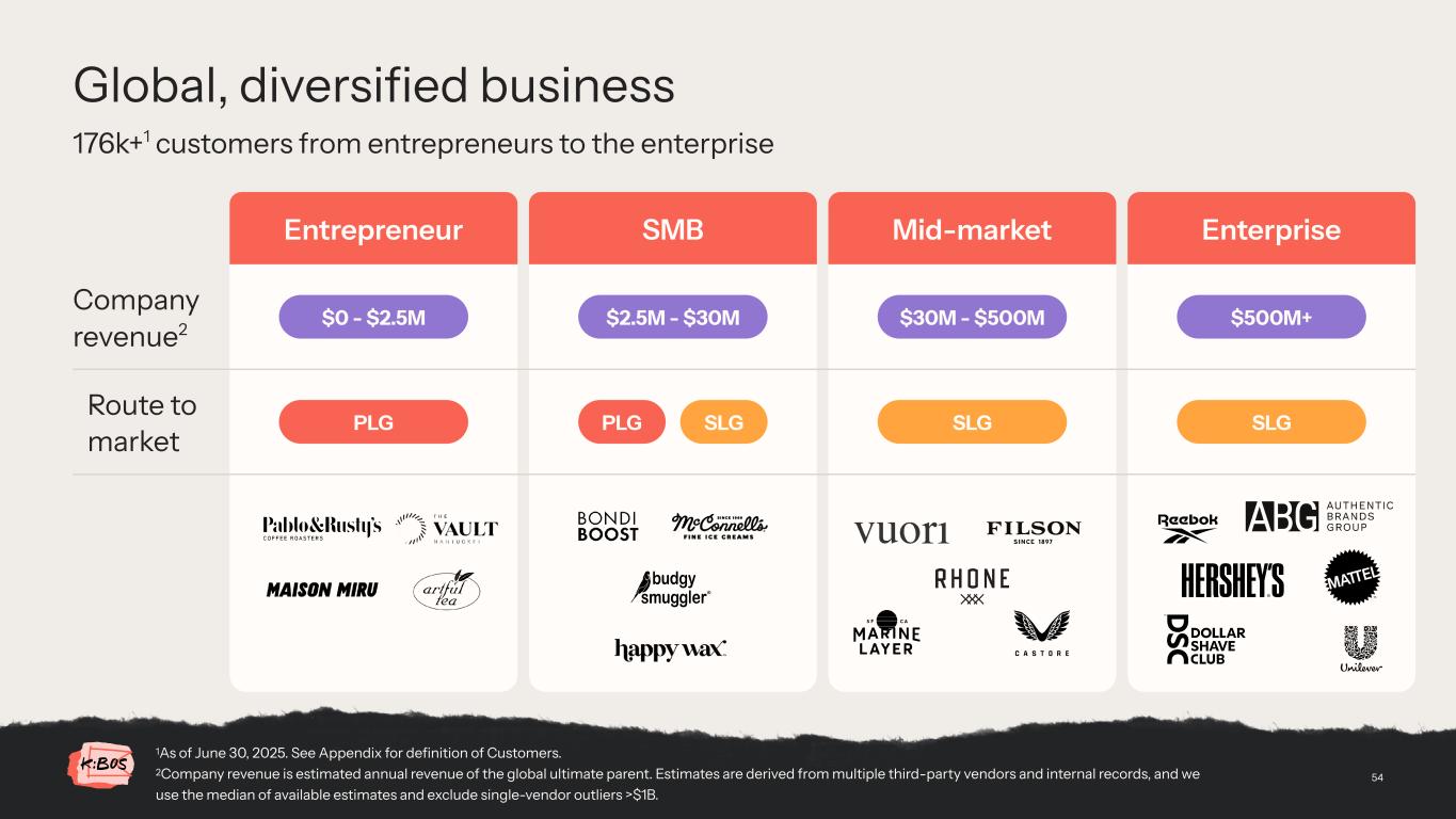 54 Entrepreneur SMB Mid-market Enterprise $0 - $2.5M $2.5M - $30M $30M - $500M $500M+ PLG PLG SLG SLG SLG 176k+1 customers from entrepreneurs to the enterprise Company revenue2 Route to market Global, diversified business 1As of June 30, 2025. See Appendix for definition of Customers. 2Company revenue is estimated annual revenue of the global ultimate parent. Estimates are derived from multiple third-party vendors and internal records, and we use the median of available estimates and exclude single-vendor outliers >$1B.
