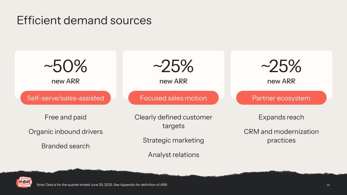 55 Efficient demand sources Free and paid Organic inbound drivers Branded search Expands reach CRM and modernization practices Clearly defined customer targets Strategic marketing Analyst relations Self-serve/sales-assisted Focused sales motion Partner ecosystem ~50% new ARR ~25% new ARR ~25% new ARR Note: Data is for the quarter ended June 30, 2025. See Appendix for definition of ARR.