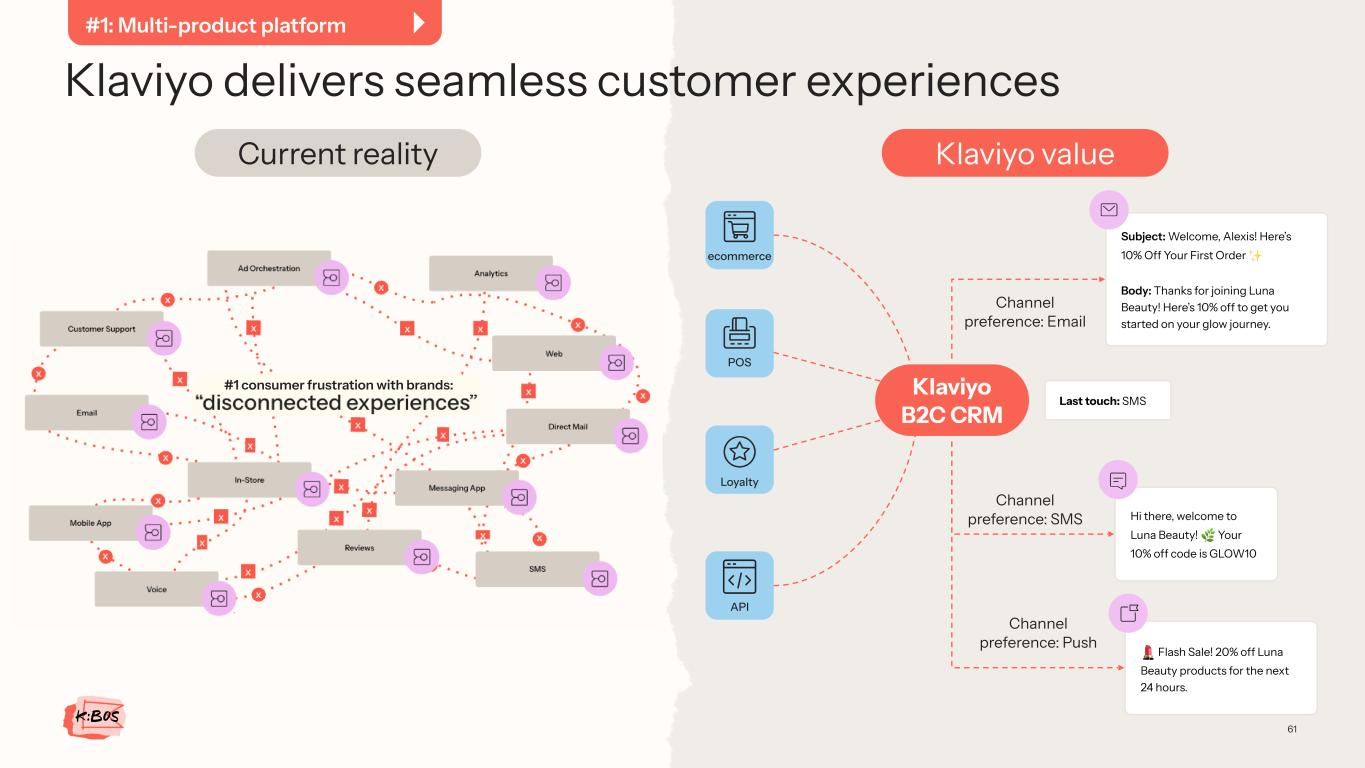 61 Current reality Klaviyo value Hi there, welcome to Luna Beauty! ! Your 10% off code is GLOW10 Subject: Welcome, Alexis! Here’s 10% Off Your First Order ✨ Body: Thanks for joining Luna Beauty! Here’s 10% off to get you started on your glow journey. ecommerce POS Loyalty API Channel preference: Email Channel preference: SMS Last touch: SMS # Flash Sale! 20% off Luna Beauty products for the next 24 hours. Channel preference: Push Klaviyo B2C CRM Klaviyo delivers seamless customer experiences #1: Multi-product platform #1 consumer frustration with brands: