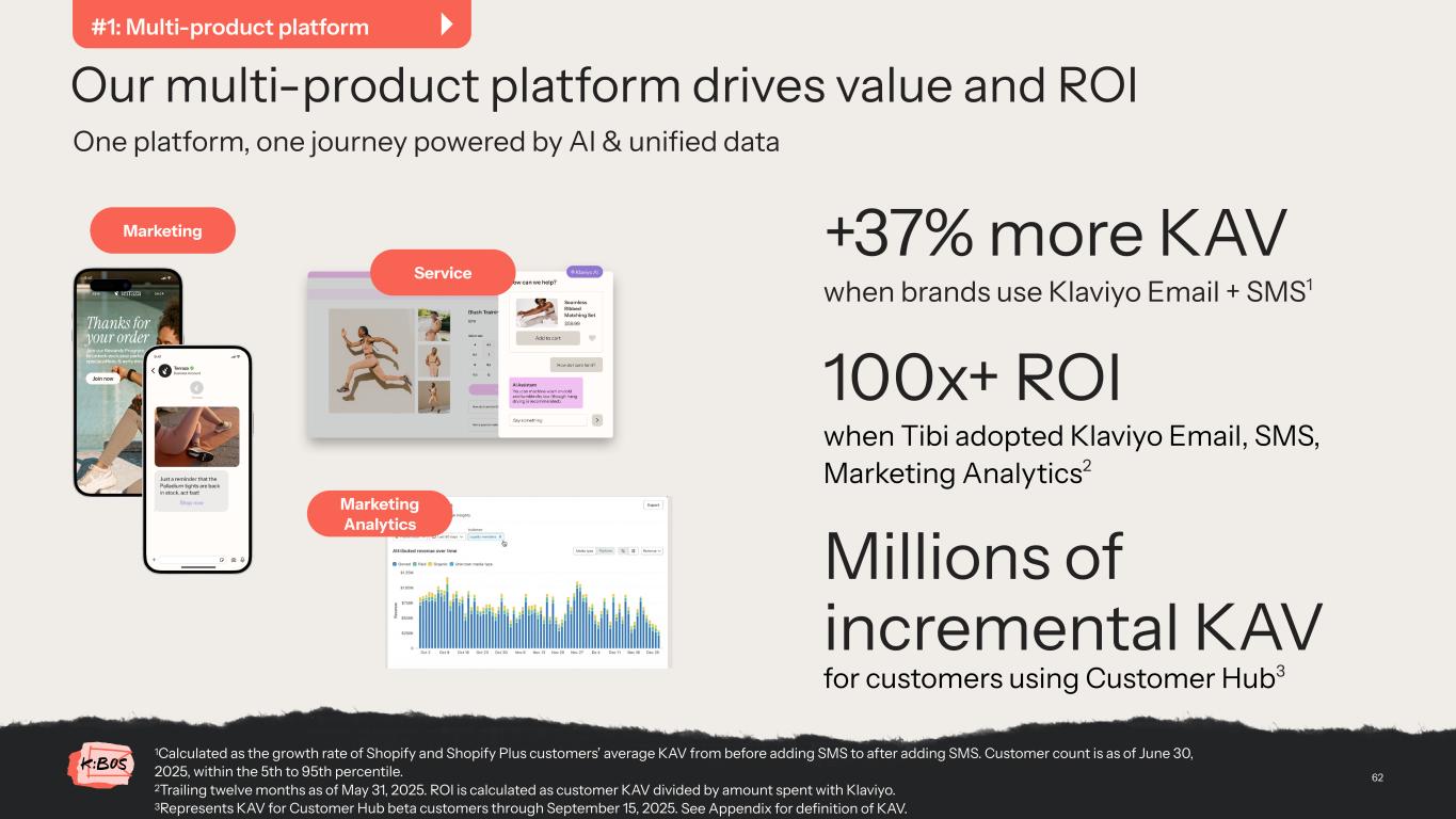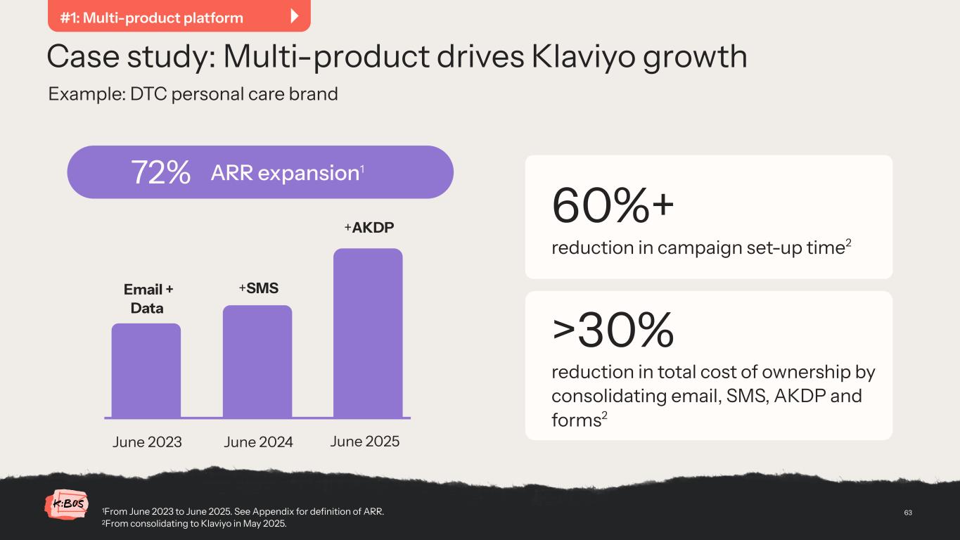 62 Our multi-product platform drives value and ROI +37% more KAV when brands use Klaviyo Email + SMS1 100x+ ROI when Tibi adopted Klaviyo Email, SMS, Marketing Analytics2 Millions of incremental KAV for customers using Customer Hub3 Marketing Service Marketing Analytics One platform, one journey powered by AI & unified data 1Calculated as the growth rate of Shopify and Shopify Plus customers’ average KAV from before adding SMS to after adding SMS. Customer count is as of June 30, 2025, within the 5th to 95th percentile. 2Trailing twelve months as of May 31, 2025. ROI is calculated as customer KAV divided by amount spent with Klaviyo. 3Represents KAV for Customer Hub beta customers through September 15, 2025. See Appendix for definition of KAV. #1: Multi-product platform