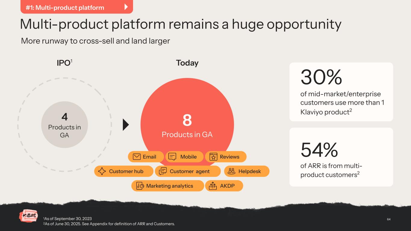 63 June 2023 June 2024 June 2025 +AKDP +SMS Example: DTC personal care brand Email + Data Case study: Multi-product drives Klaviyo growth 1From June 2023 to June 2025. See Appendix for definition of ARR. 2From consolidating to Klaviyo in May 2025. 60%+ reduction in campaign set-up time2 >30% reduction in total cost of ownership by consolidating email, SMS, AKDP and forms2 72% ARR expansion1 #1: Multi-product platform