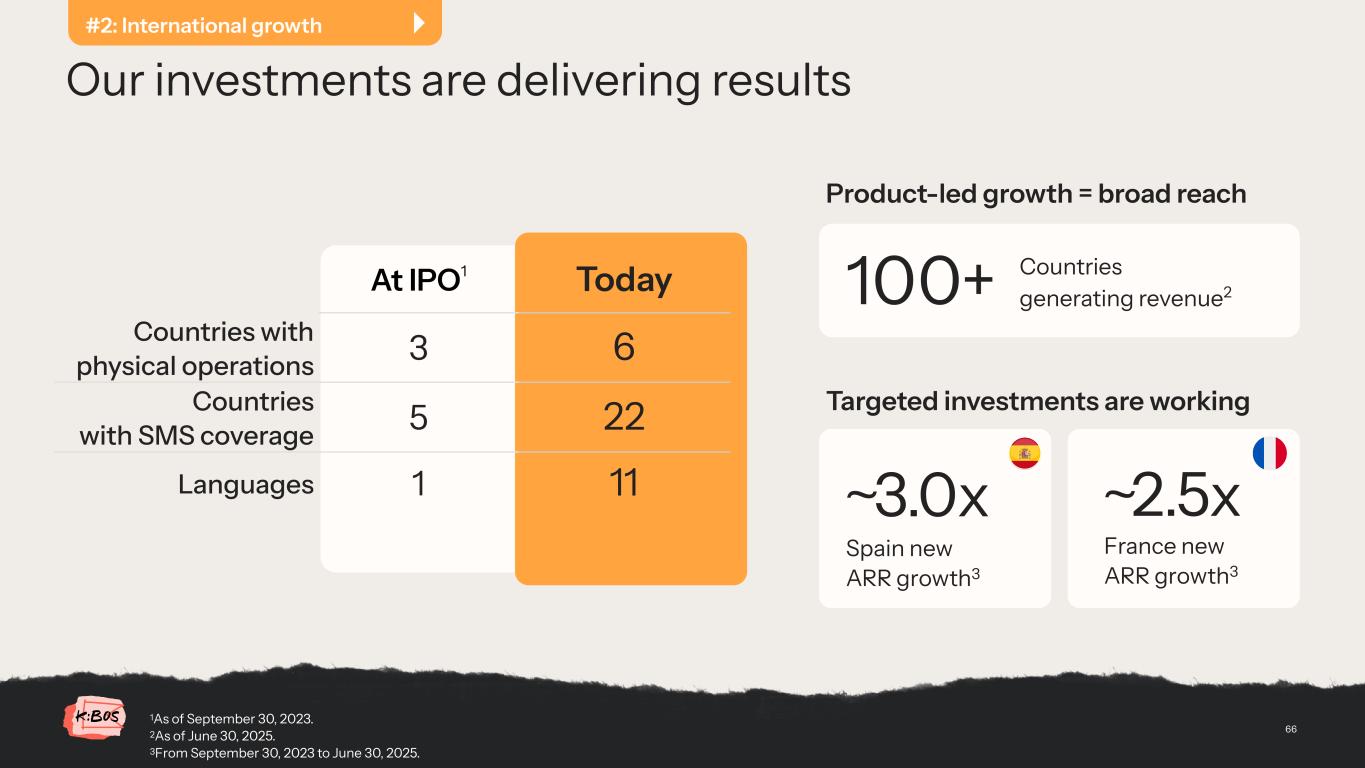 66 ~2.5x France new ARR growth3 ~3.0x Spain new ARR growth3 Our investments are delivering results Targeted investments are working Product-led growth = broad reach 100+ Countries generating revenue2 1As of September 30, 2023. 2As of June 30, 2025. 3From September 30, 2023 to June 30, 2025. #2: International growth At IPO1 Today Countries with physical operations 3 6 Countries with SMS coverage 5 22 Languages 1 11