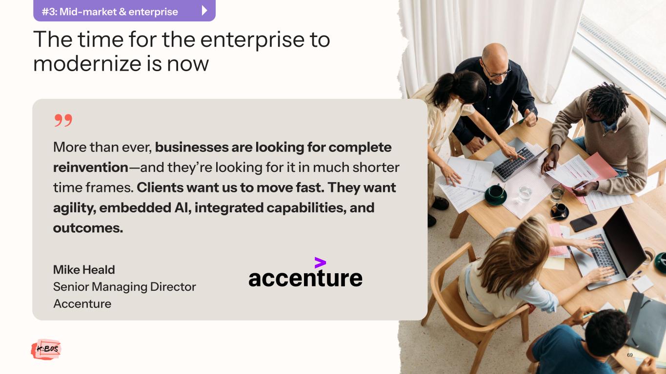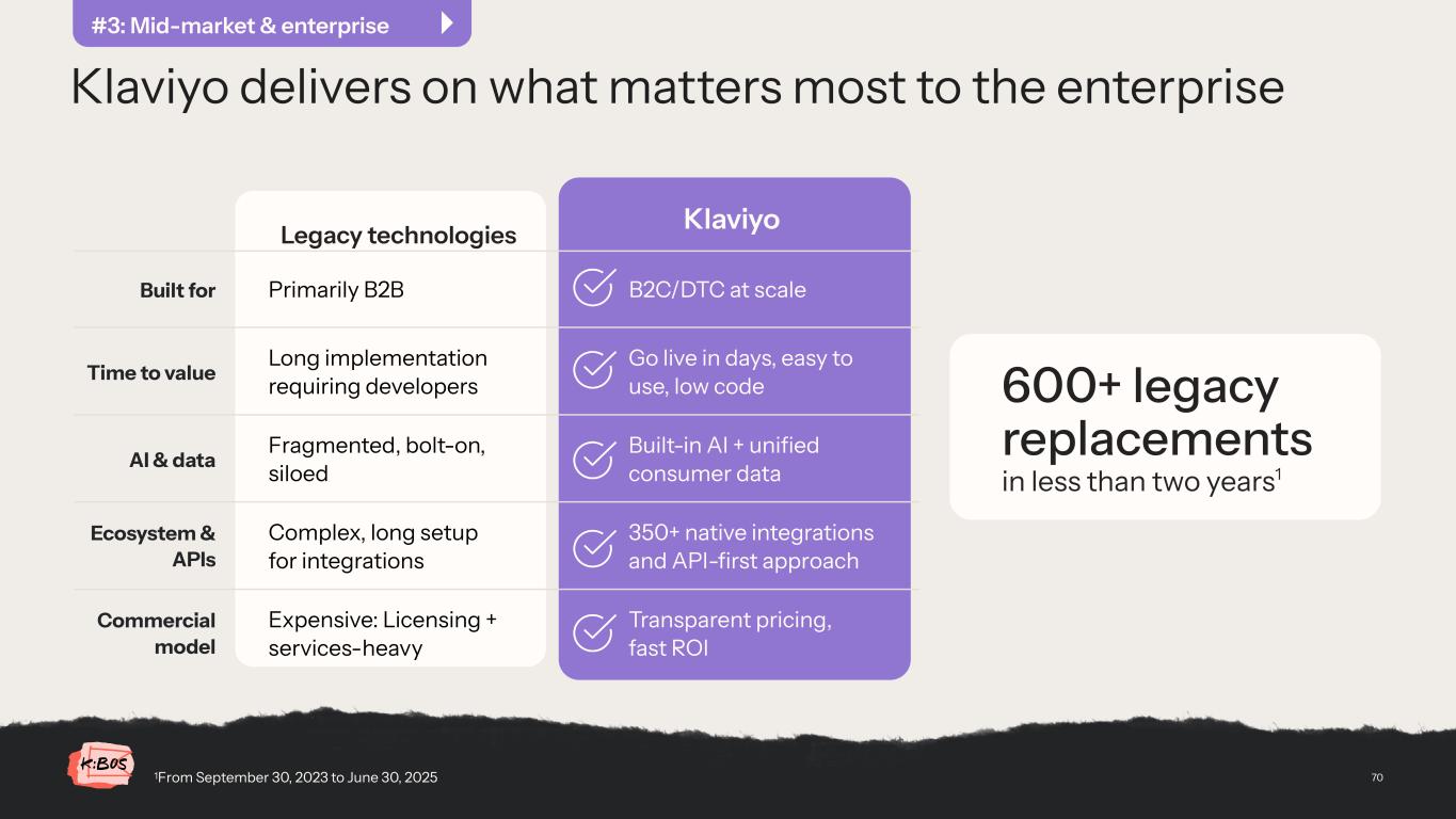 2025 © Klaviyo 69 The time for the enterprise to modernize is now More than ever, businesses are looking for complete reinvention—and they’re looking for it in much shorter time frames. Clients want us to move fast. They want agility, embedded AI, integrated capabilities, and outcomes. Mike Heald Senior Managing Director Accenture #3: Mid-market & enterprise