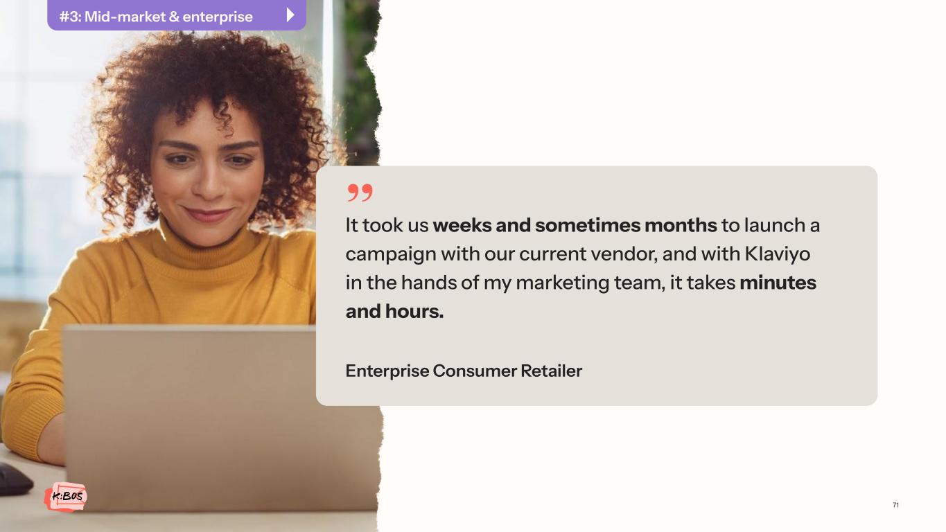 71 It took us weeks and sometimes months to launch a campaign with our current vendor, and with Klaviyo in the hands of my marketing team, it takes minutes and hours. Enterprise Consumer Retailer #3: Mid-market & enterprise