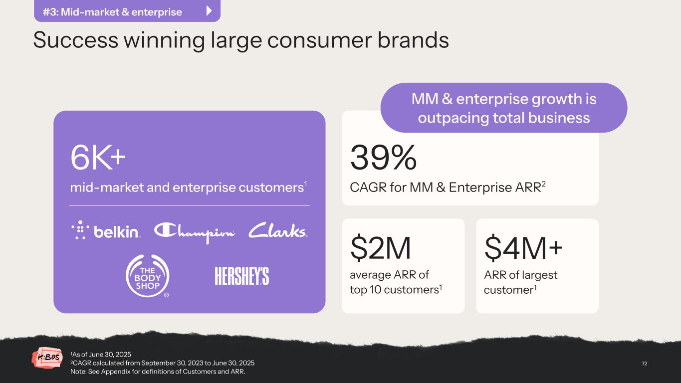 72 Success winning large consumer brands 39% CAGR for MM & Enterprise ARR2 MM & enterprise growth is outpacing total business 6K+ mid-market and enterprise customers1 $2M average ARR of top 10 customers1 1As of June 30, 2025 2CAGR calculated from September 30, 2023 to June 30, 2025 Note: See Appendix for definitions of Customers and ARR. $4M+ ARR of largest customer1 #3: Mid-market & enterprise