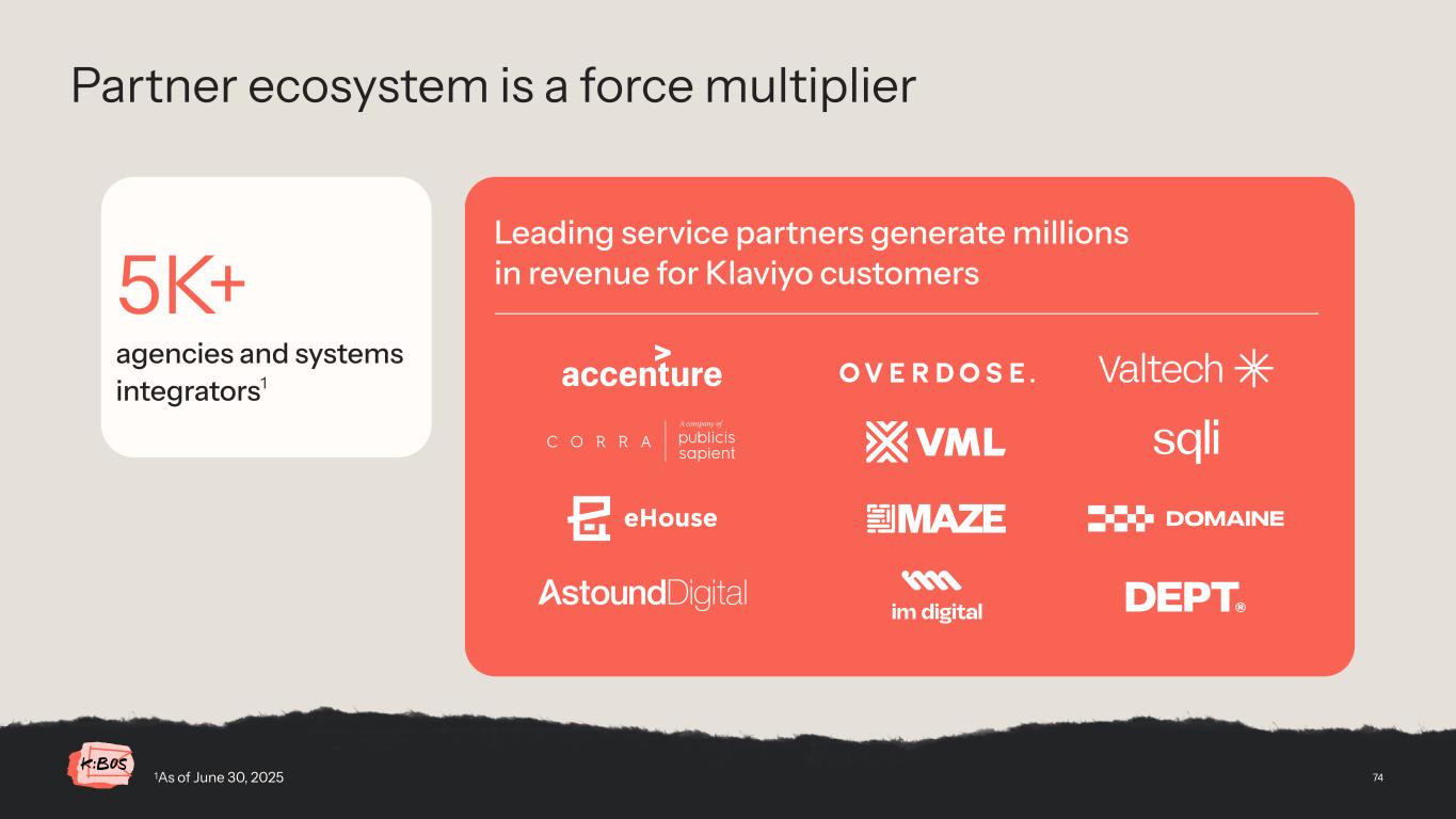 2025 © Klaviyo Confidential 74 Partner ecosystem is a force multiplier 5K+ agencies and systems integrators1 Leading service partners generate millions in revenue for Klaviyo customers 1As of June 30, 2025