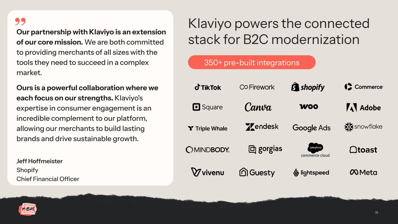 2025 © Klaviyo Confidential 75 Klaviyo powers the connected stack for B2C modernization 350+ pre-built integrations Our partnership with Klaviyo is an extension of our core mission. We are both committed to providing merchants of all sizes with the tools they need to succeed in a complex market. Ours is a powerful collaboration where we each focus on our strengths. Klaviyo's expertise in consumer engagement is an incredible complement to our platform, allowing our merchants to build lasting brands and drive sustainable growth. Jeff Hoffmeister Shopify Chief Financial Officer