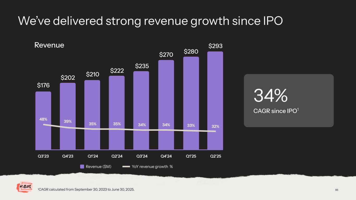 86 We’ve delivered strong revenue growth since IPO 34% CAGR since IPO1 Revenue Q3’23 Q4’23 Q1’24 Q2’24 Q3’24 Q4’24 Q1’25 Q2’25 $176 $202 $210 $222 $235 $270 $280 $293 48% 39% 35% 35% 34% 34% 33% 32% 48% 39% 3 3 33% 32% 1CAGR calculated from September 30, 2023 to June 30, 2025. YoY revenue growth %Revenue ($M)