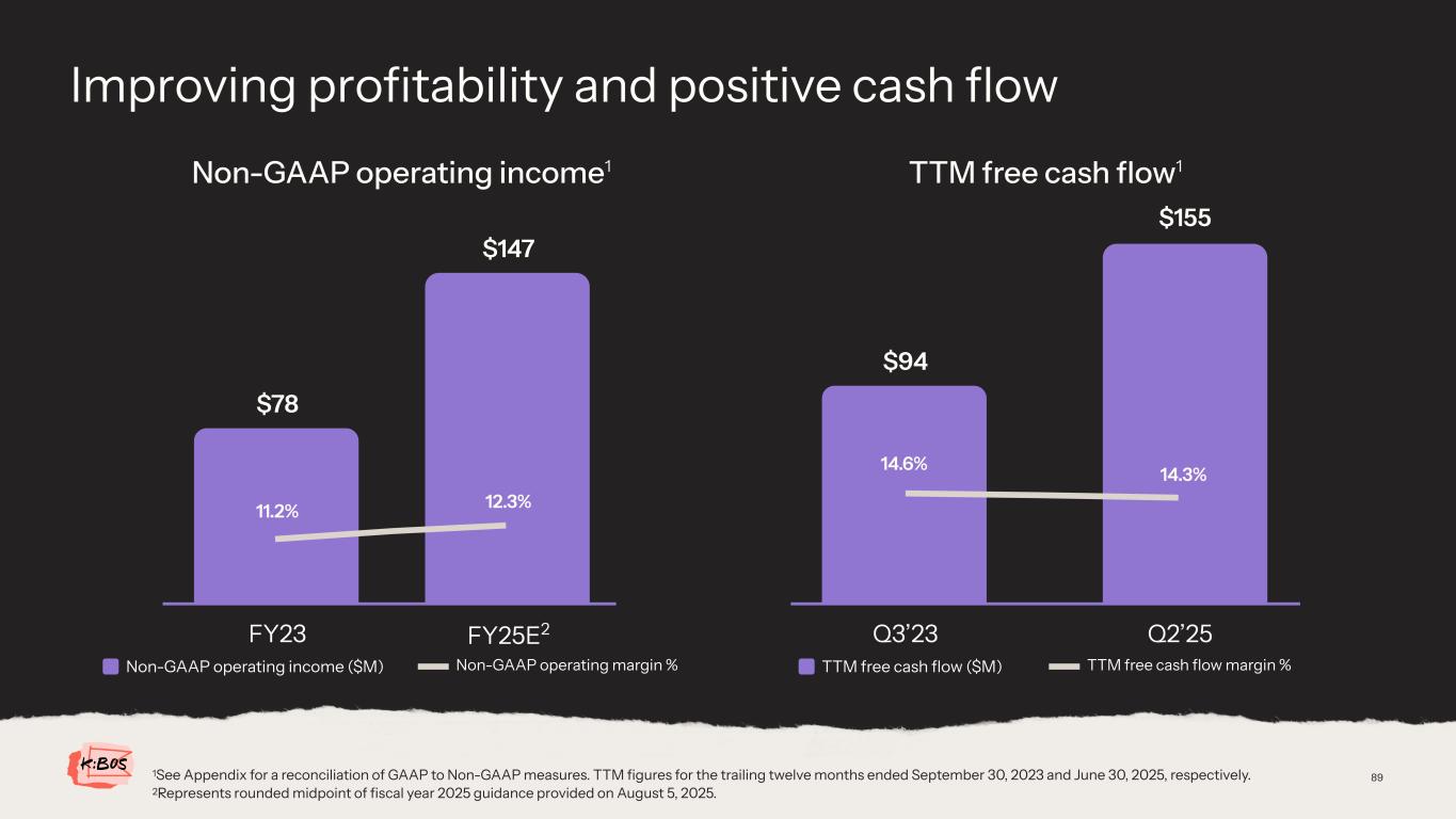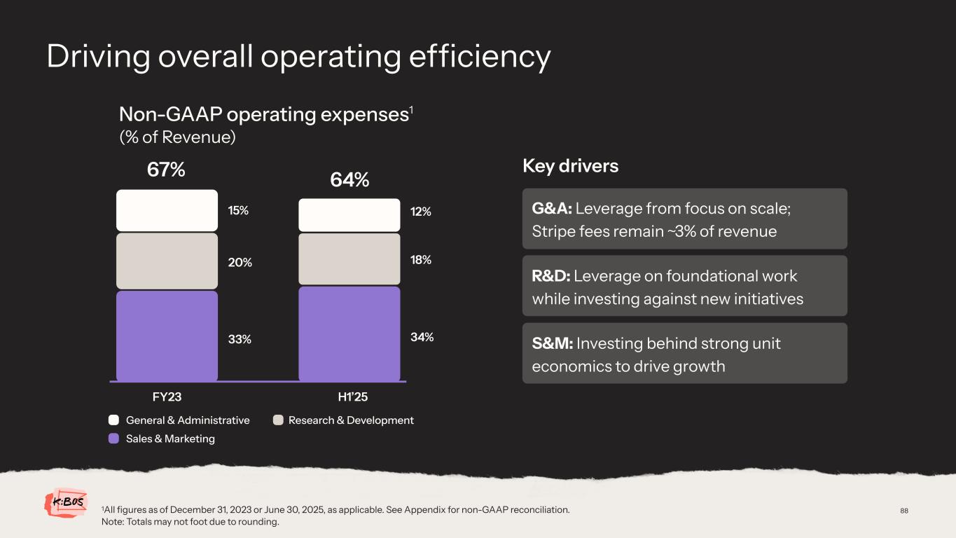 88 Non-GAAP operating expenses1 (% of Revenue) Driving overall operating efficiency FY23 15% Key drivers 20% 33% H1’25 12% 18% 34% Sales & Marketing Research & DevelopmentGeneral & Administrative G&A: Leverage from focus on scale; Stripe fees remain ~3% of revenue R&D: Leverage on foundational work while investing against new initiatives S&M: Investing behind strong unit economics to drive growth 67% 64% 1All figures as of December 31, 2023 or June 30, 2025, as applicable. See Appendix for non-GAAP reconciliation. Note: Totals may not foot due to rounding.