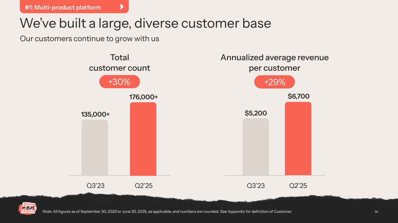 94 We’ve built a large, diverse customer base Total customer count Our customers continue to grow with us #1: Multi-product platform 135,000+ 176,000+ Q3’23 Q2’25 Annualized average revenue per customer $5,200 $6,700 Q3’23 Q2’25 Note: All figures as of September 30, 2023 or June 30, 2025, as applicable, and numbers are rounded. See Appendix for definition of Customer. +30% +29%