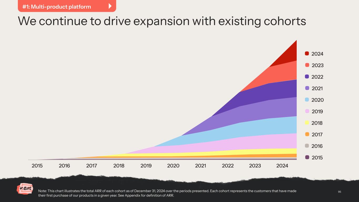 95 We continue to drive expansion with existing cohorts Note: This chart illustrates the total ARR of each cohort as of December 31, 2024 over the periods presented. Each cohort represents the customers that have made their first purchase of our products in a given year. See Appendix for definition of ARR. 2023 2024 2021 2022 2019 2020 2017 2018 2015 2016 2024202320222021202020192018201720162015 #1: Multi-product platform